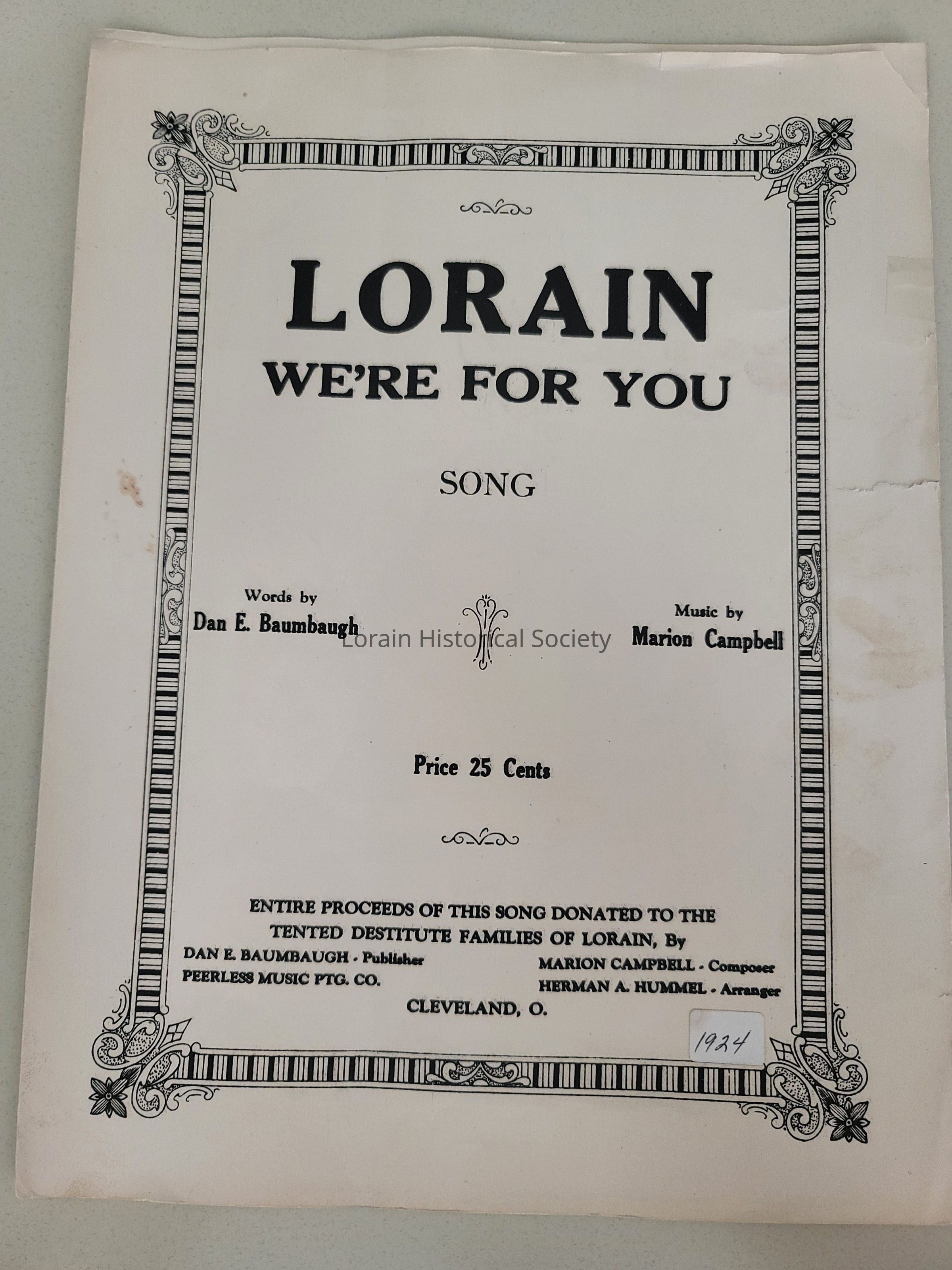 Sheet music for song titled Lorain We're Here For You. Words by Dan E. Baumbaugh. Music by Marion Campbell. Price was 25 cents. Entire proceeds of this song donated to the tented destitute families of Lorain after the Lorain tornado.