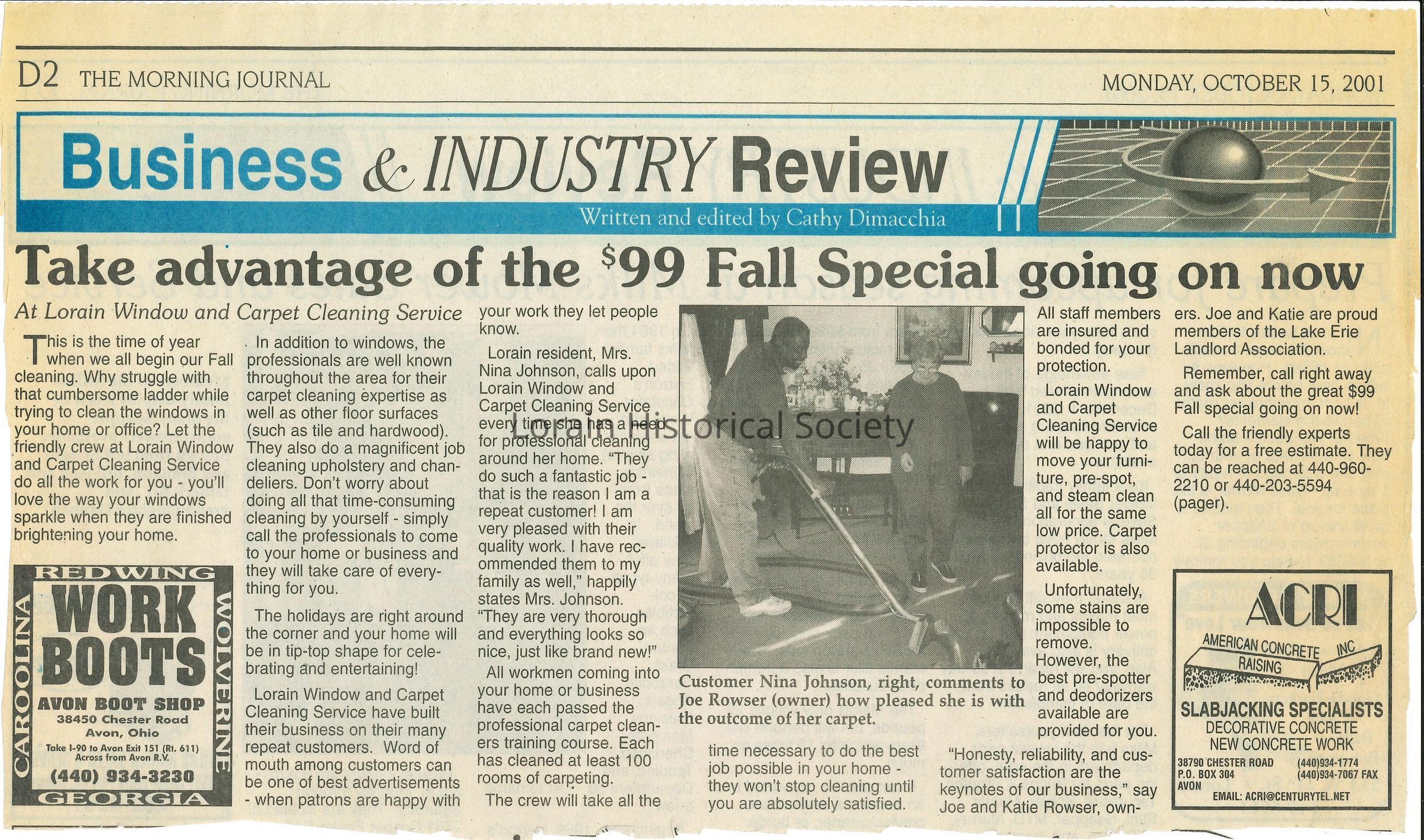 This collection of newspaper articles and ads, highlighting the Lorain Window and Carpet Cleaning Service $99 Special, was donated by Katie Rowser.Collection