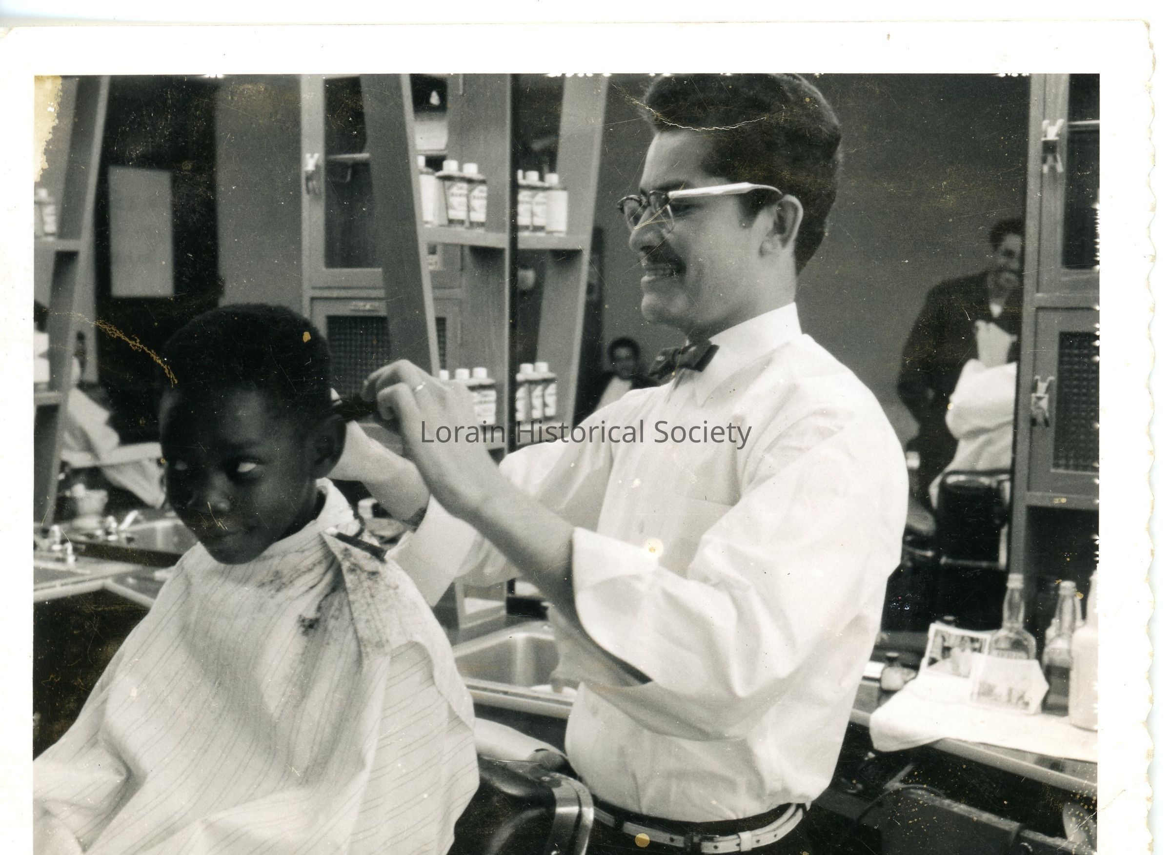 Black and white 3x5" photo of Louis Velez cutting hair at La Fortuna Barber Shop, 1556 E 29th Street. Louis Velez was the first Puerto Rican barber in Lorain. Photo was taken by "a Mexican gentleman who used to take photos around Lorain."Collection