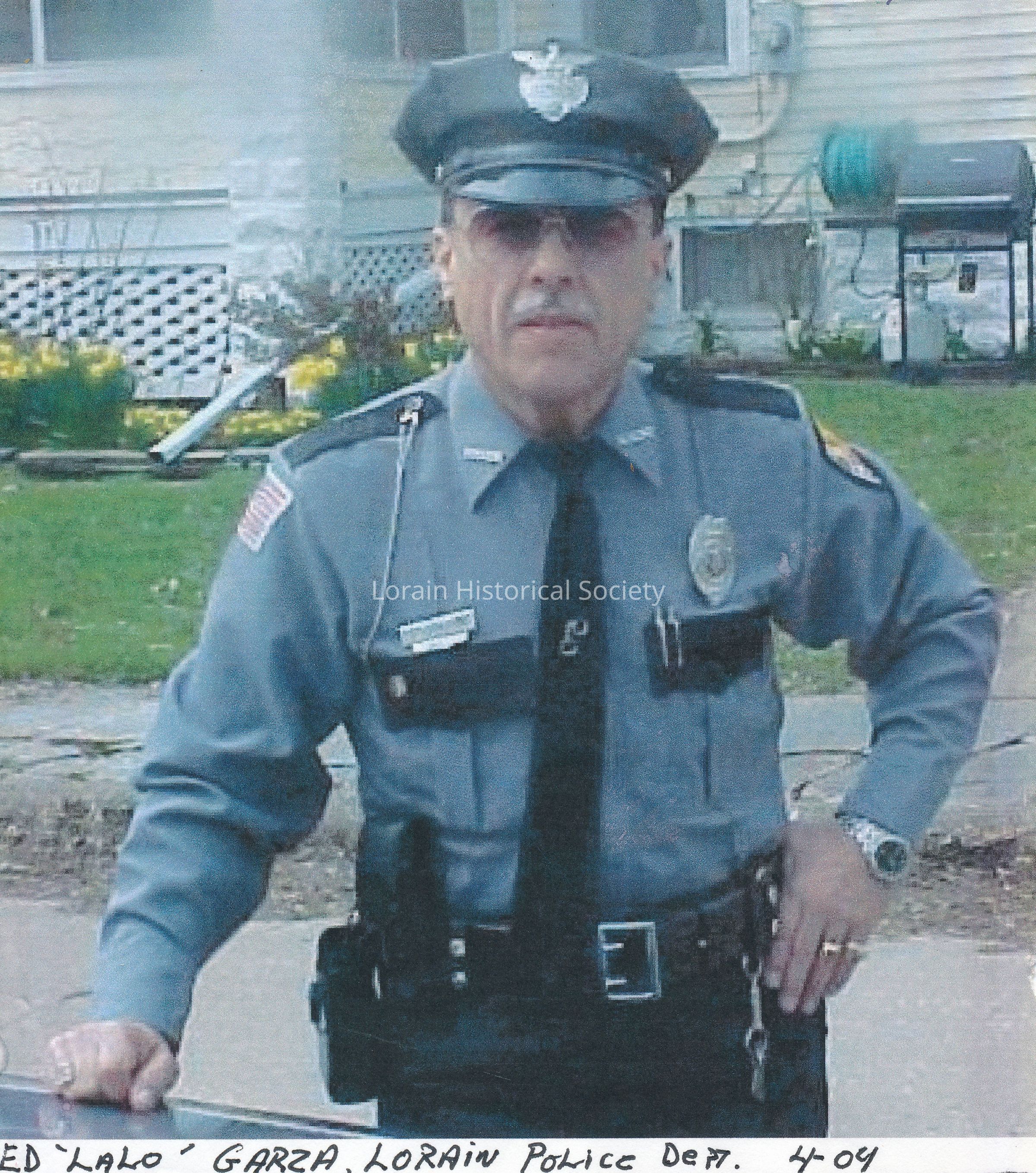 Photo of Ed Garza in his uniform as an officer of the Lorain Police Department. His nickname was "Lalo." Mr. Garza was made a sergeant about a year after this photo was taken (2005). He retired in 2008.Collection
