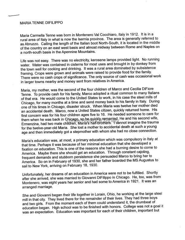 Short biography of Maria Tenne DiFilippo, written by her son John DiFilippo. Maria was born in Montenero Val Cocchiaro (generally referred to as Abruzzo) in 1912. She came to America in 1930, married Giovanni DiFilippo, and they moved to Lorain. She worked at St. Joseph Hospital for 25 years, retiring in 1977.Acquisition