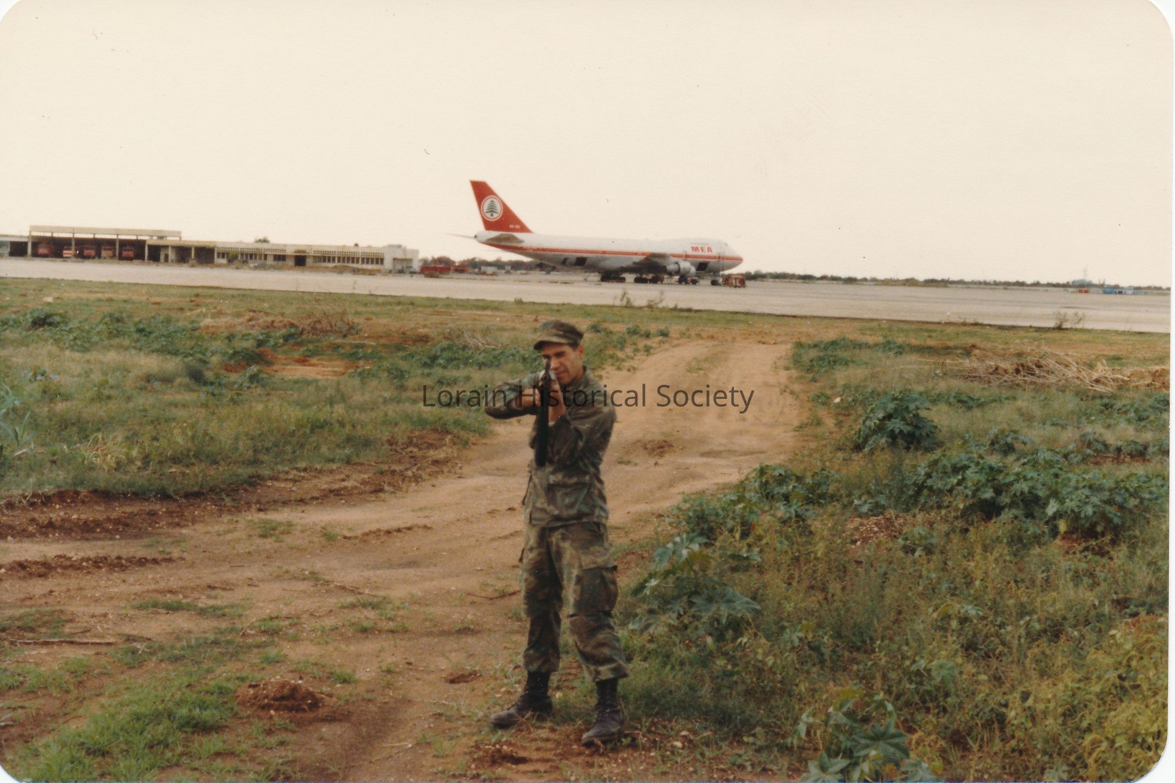 Photo of Arvin Morell pointing his gun at the camera in Lebanon in the early 1980s. Arvin is wearing his fatigues and is standing in a grassy area by an airfield. A Middle East Airlines (MEA) plane can be seen in the background. Arvin served in the U.S. Marine Corps between 1980 and 1984 and participated in military peace-keeping operations in Lebanon during the Lebanese Civil War.Collection