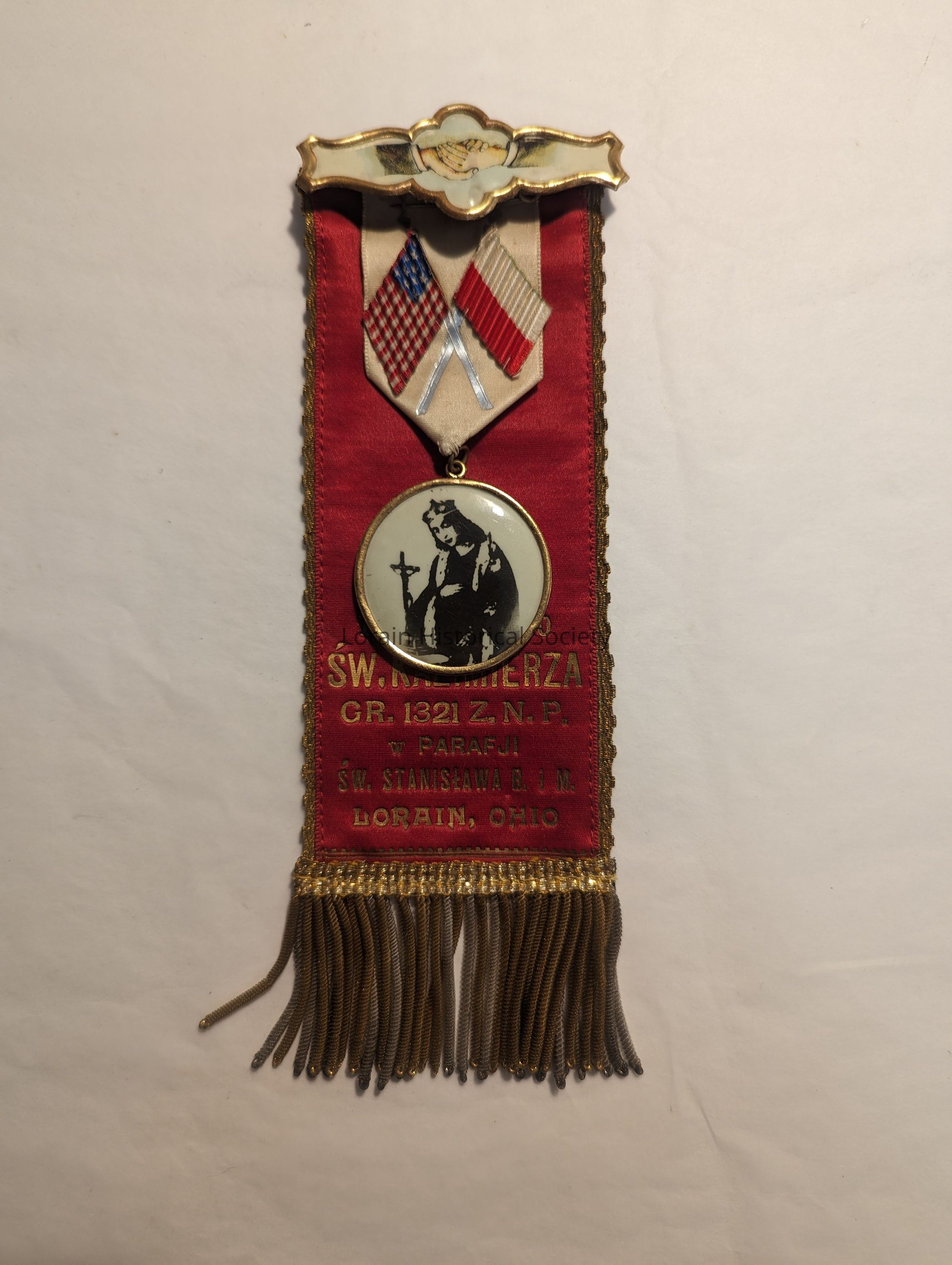 1 medal inscribed in the Polish written language from Lorain, Ohio. 1 ribbon with silver and gold coil fringe, two pins and one medal. The pin with the medal on it has the Polish and American flags. A pin at the top has two hands shaking. The medal has a figure with a hat and a crucifix in the background.Acquisition