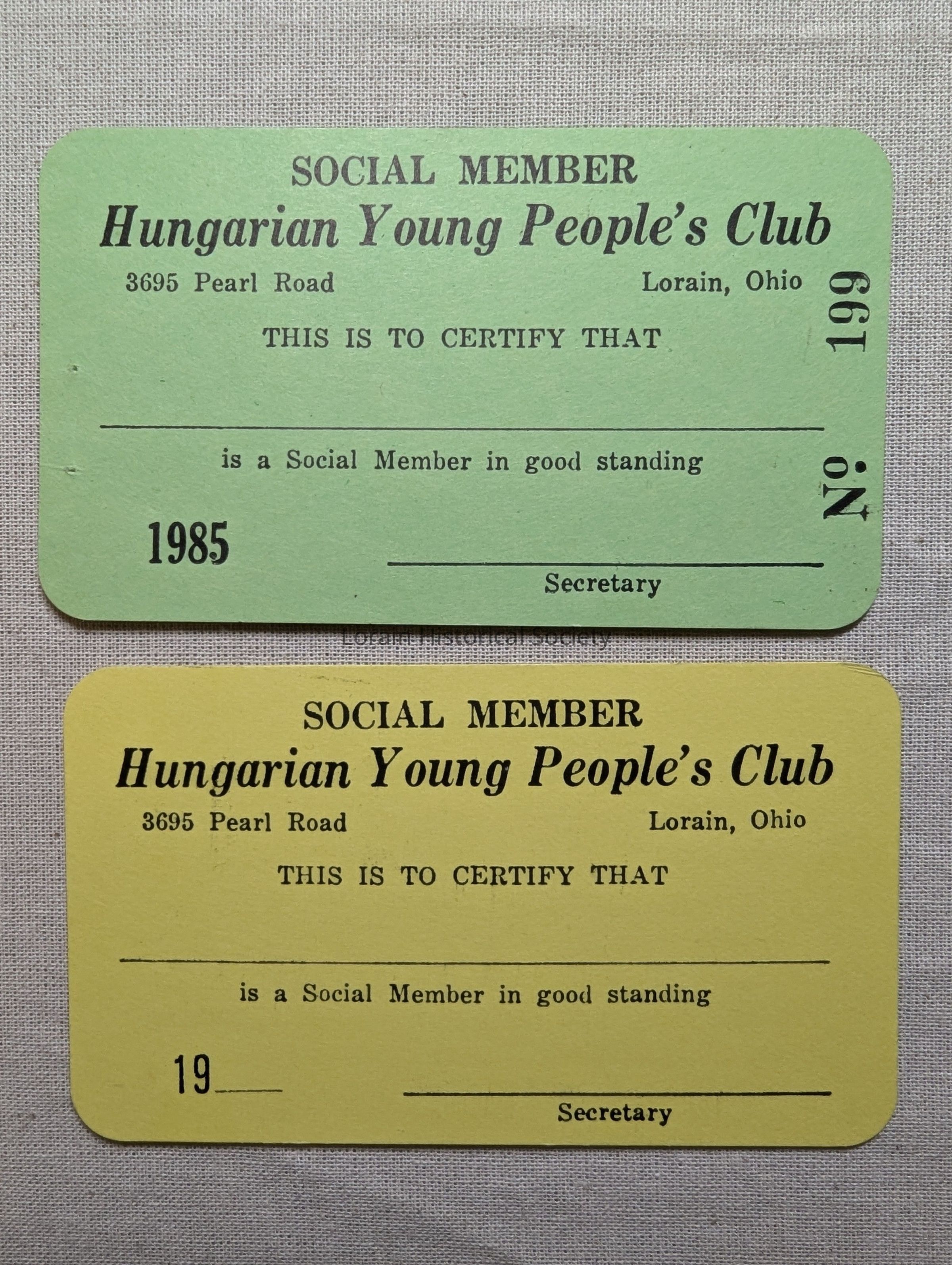 Two blank membership cards for the Hungarian Young People's Club; 3695 Pearl Road; one is green, from 1985 and one is yellow, no date; rules and regulations on reverse of both.Acquisition