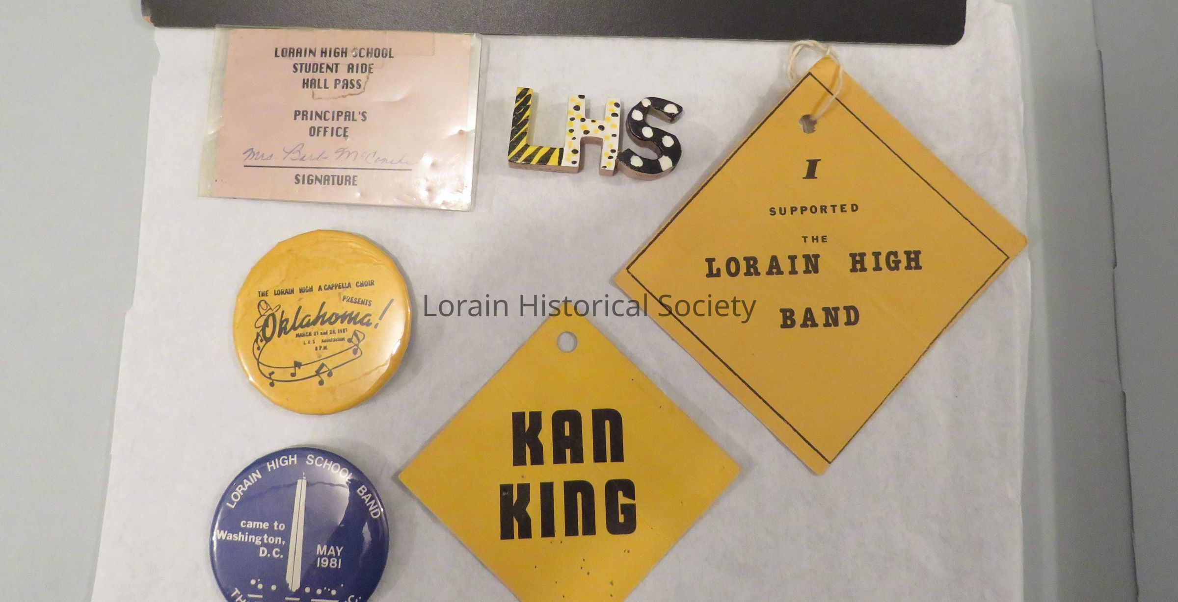 Student Aide pass; LHS A Capella Choir Pin, 1987 Oklahoma; Pin- LHS Band 1981 paper tags (2); LHS in wood, painted letters; Badge, 1981 Band Trip to Washington, D.C. (6 total)Acquisition