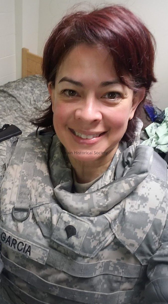 Photo (selfie) of Michelle Garcia wearing her Ohio Army National Guard fatigues in 2016. Michelle first enlisted in 1989 and then re-enlisted in 2016. After her re-enlistment, Michelle belonged to the 945th Engineer Company in Norwalk, Ohio.Collection