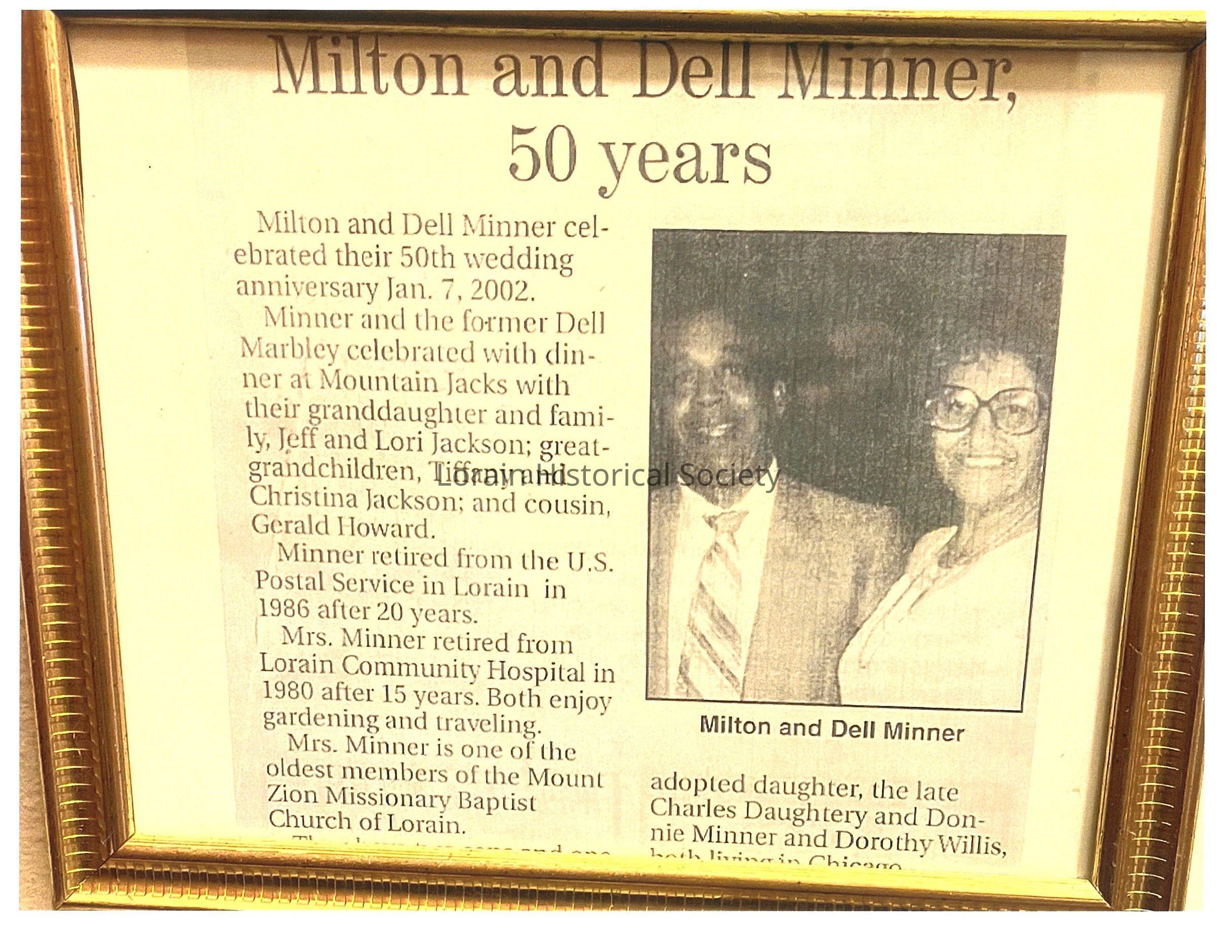 This copy of an article celebrating the 50th anniversary of Milton and Dell Minner was donated by their cousin Gerald Howard. Milton worked as a mail carrier in Lorain for 20 years and his wife worked at Lorain Community Hospital for 15 years. The Minners, who were members of Mt. Zion Missionary Baptist Church, are mentioned in Gerald Howard's oral history recording.Acquisition