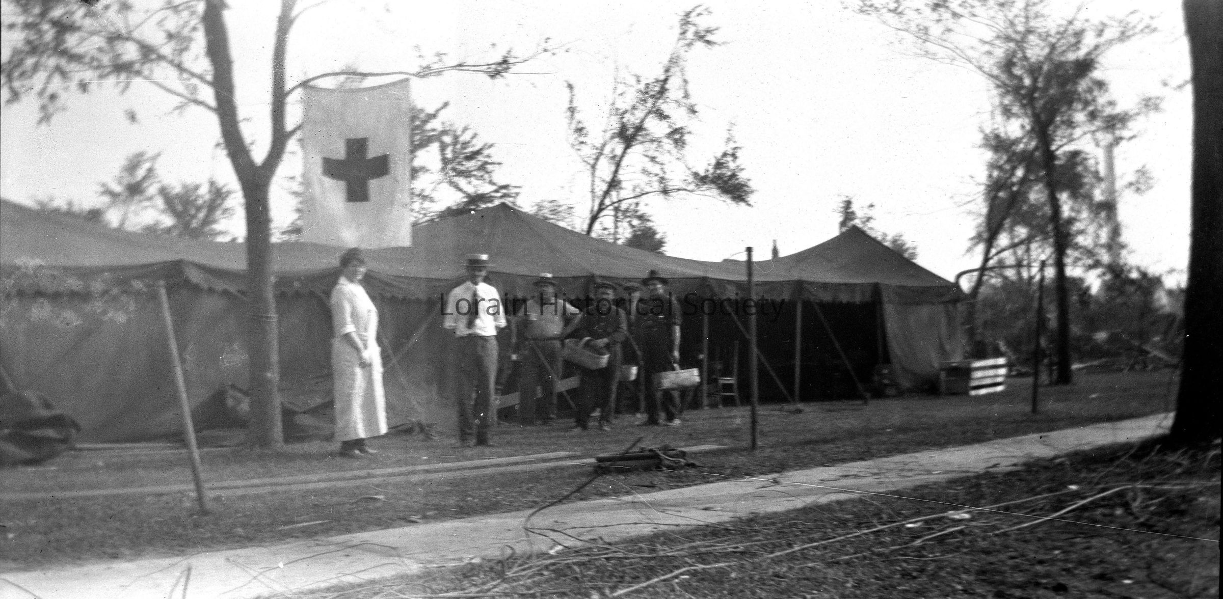 Image 6 Osburn Family photo from Tornado. Showing tents and Red Cross flag attached to tree branch with nurse and other people standing out front.Acquisition