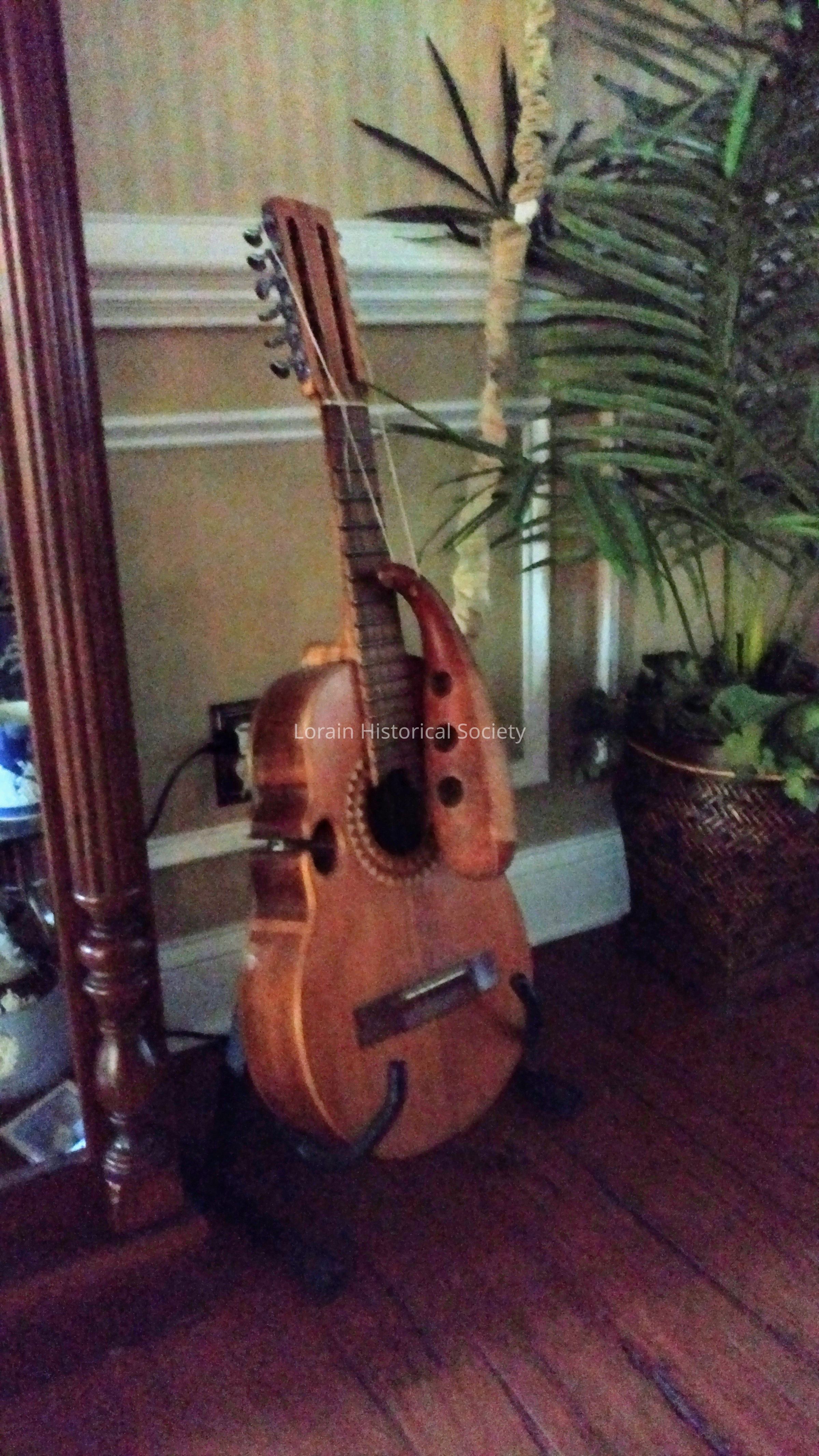 Photo of the last cuatro (and the güiro) that Timoteo Parrilla Fuentes crafted and entrusted to his daughter, María Isabel (Parrilla) Nolte, in 1981. The instrument is displayed at María Isabel's home in South Carolina.Collection