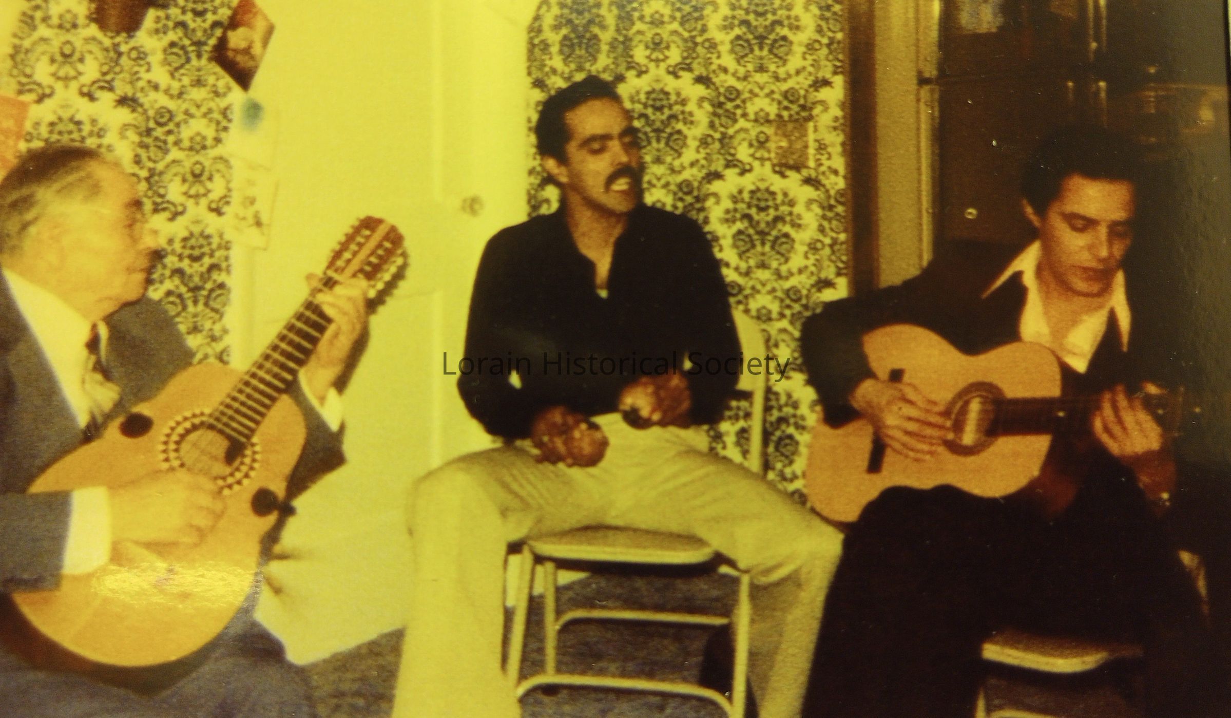 Photo of Timoteo Parrilla Fuentes (left) and his sons Eliezer (center) and José Antonio (center) playing music together in 1980. Timoteo is playing the last cuatro that he crafted himself. Eliezer is singing and Tony is playing the guitar.Collection