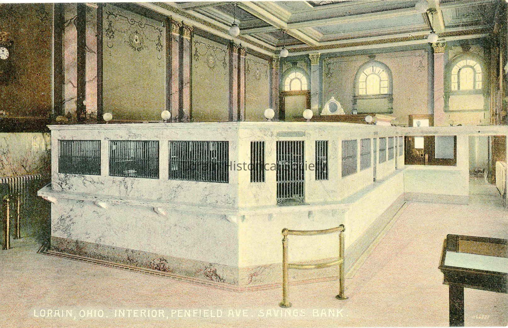 11/24/2021 AMS: nfb021103003. Color Postcard is view of Penfield Avenue Savings Bank Interior (later became Central Bank at corner of Broadway and West 20th Street). Postcard reads: "Lorain, Ohio Interior, Penfield Ave. Savings Bank". Written on back "Bought July 1914."