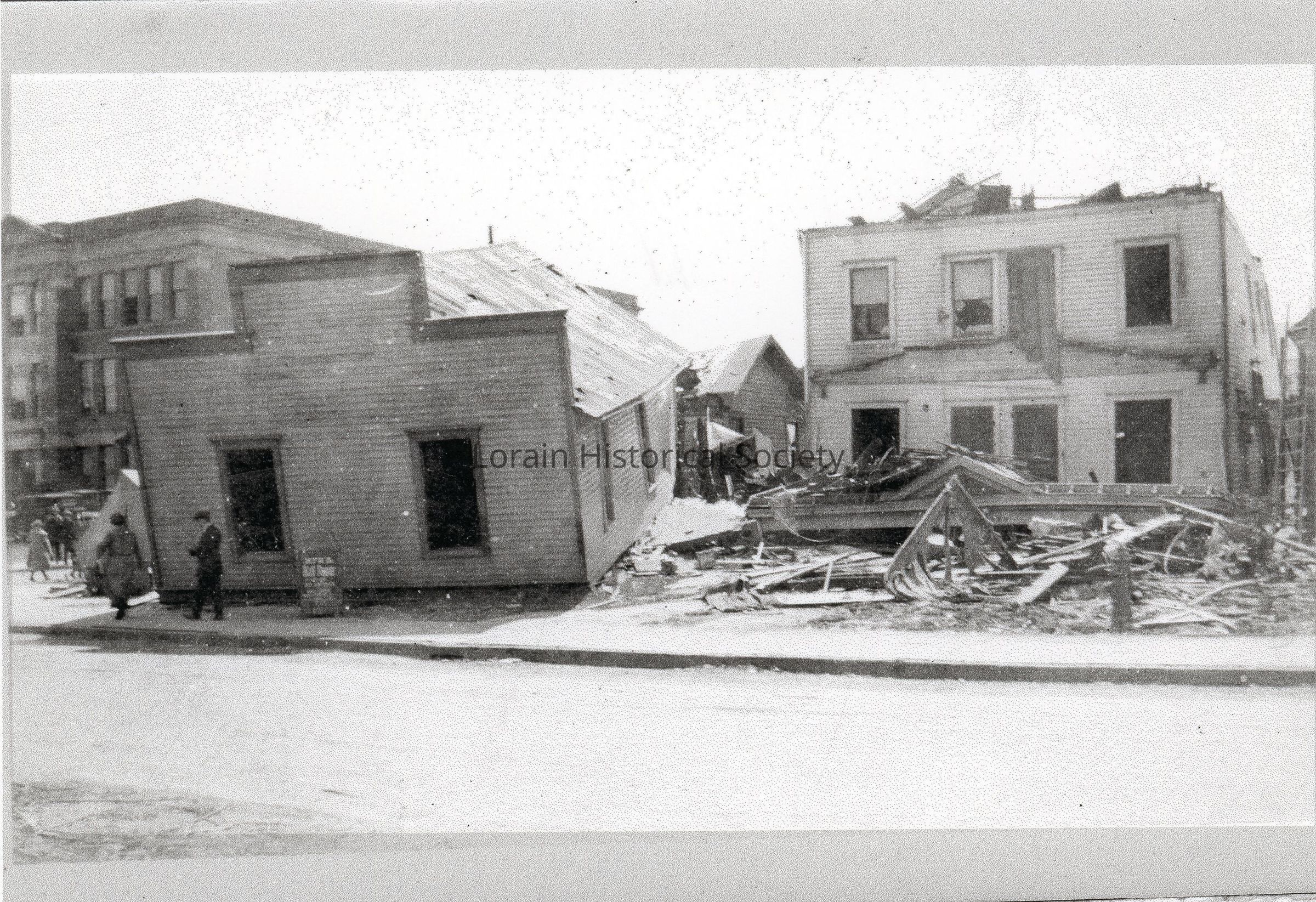 Photo copy is black and white view of (L to R) Gould's Grocery Store, 560 Washington Avenue and Martha and Richard J. Graham Home, 533 Washington Avenue, showing damage, destruction and debris from 1924 Tornado.Photograph Details