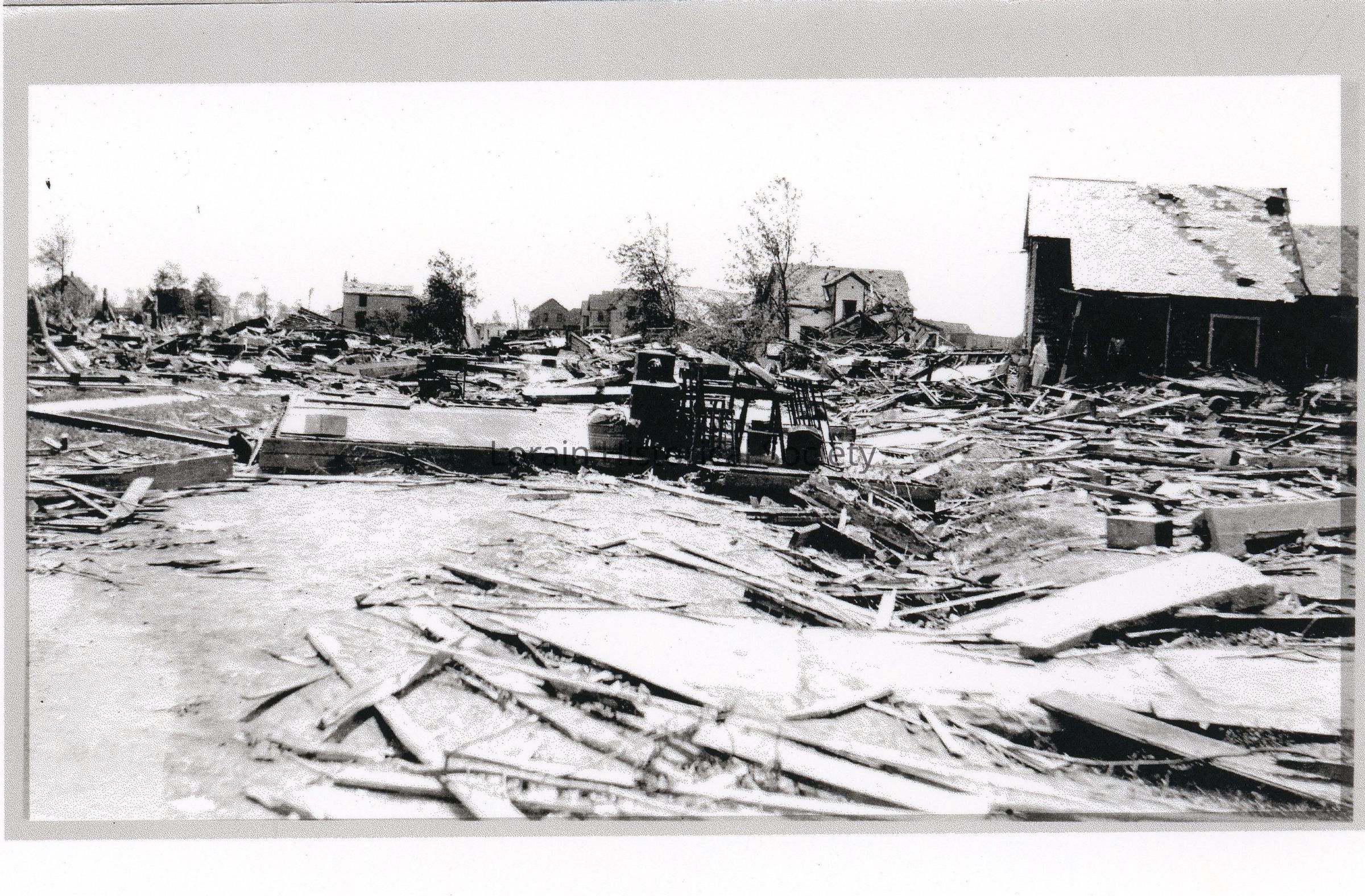 Photocopy of photograph is black and white view of unidentified houses showing damage and destruction from 1924 Tornado.Acquisition