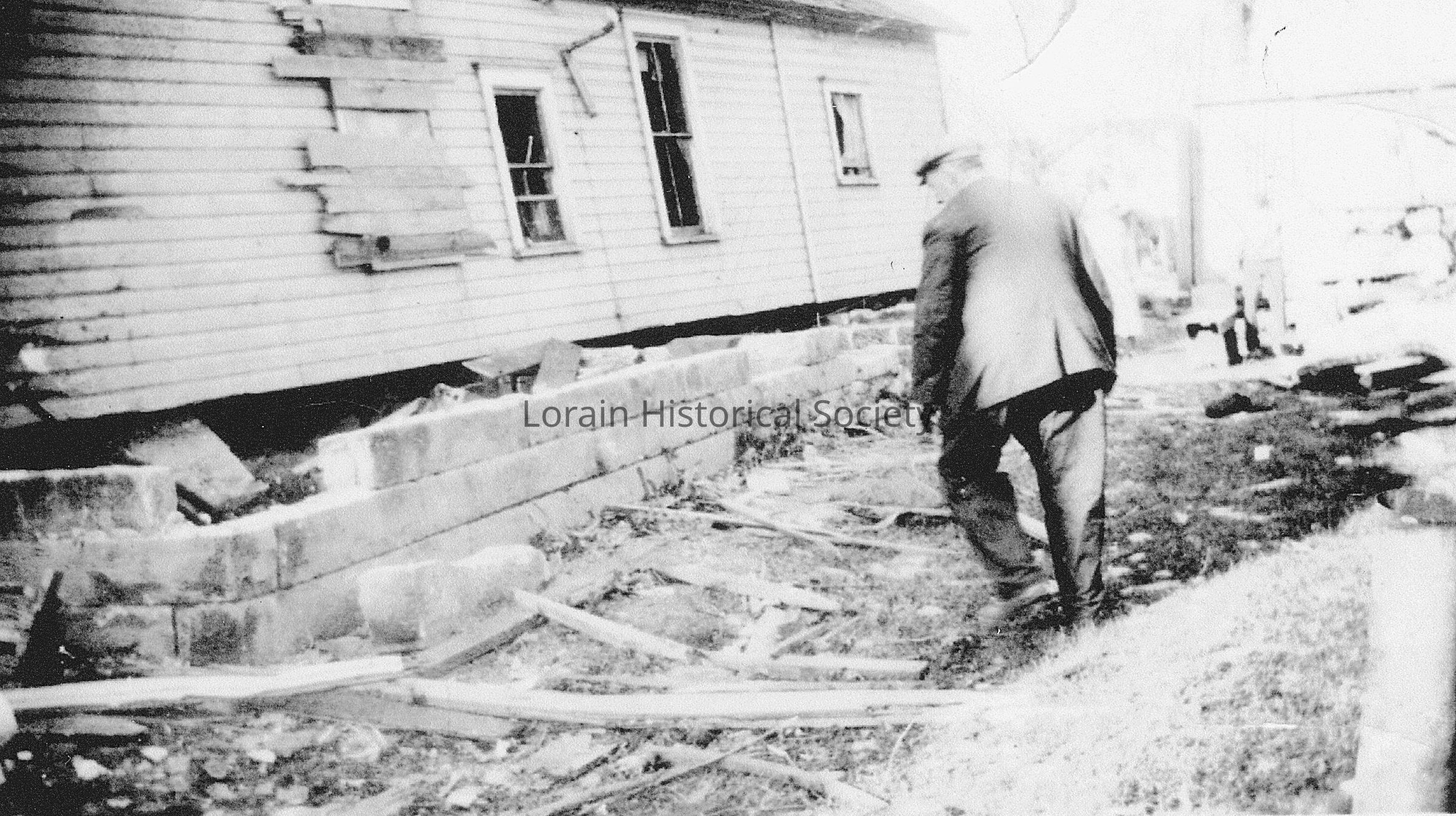 Photocopy is black and white view of 529 Hamilton Avenue, Thomas J. Walters home, showing damage, destruction and debris from 1924 Tornado. Unidentified man standing on side of house looking at damage (might be Thomas J. Walters?).Photograph Details