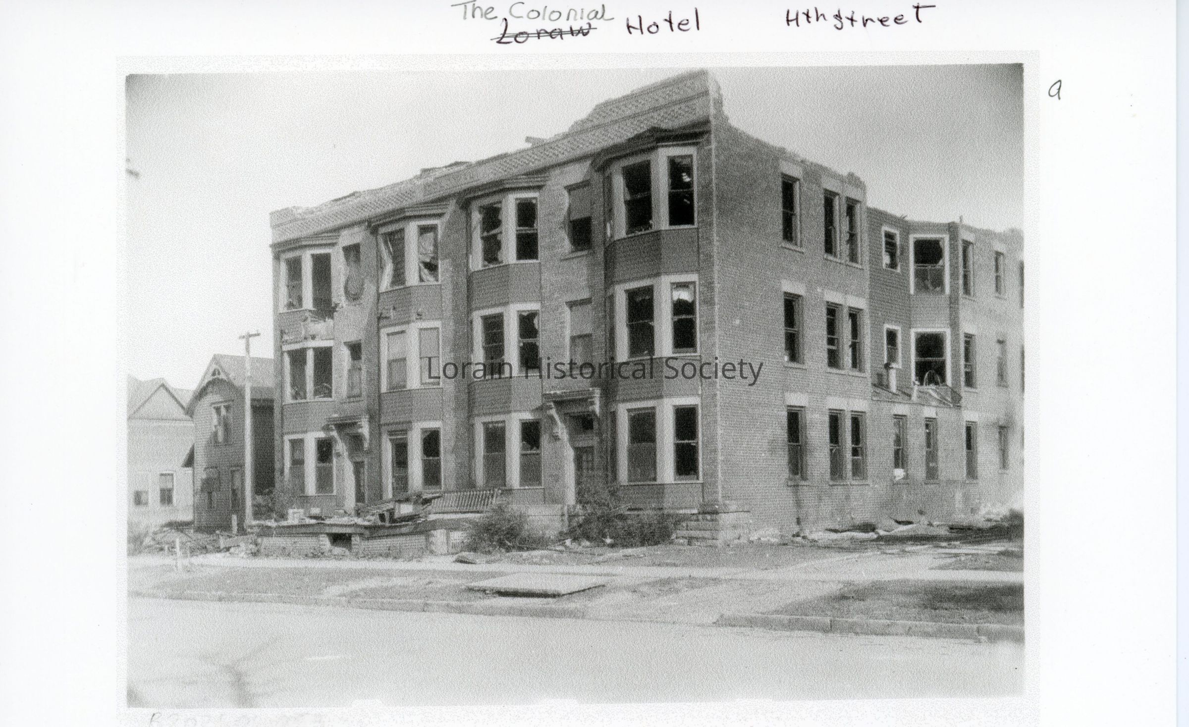 Photocopy is a black and white photograph print of the Colonial Hotel, 303-309 West Fourth Street, showing damage and debris from the 1924 Tornado.Acquisition