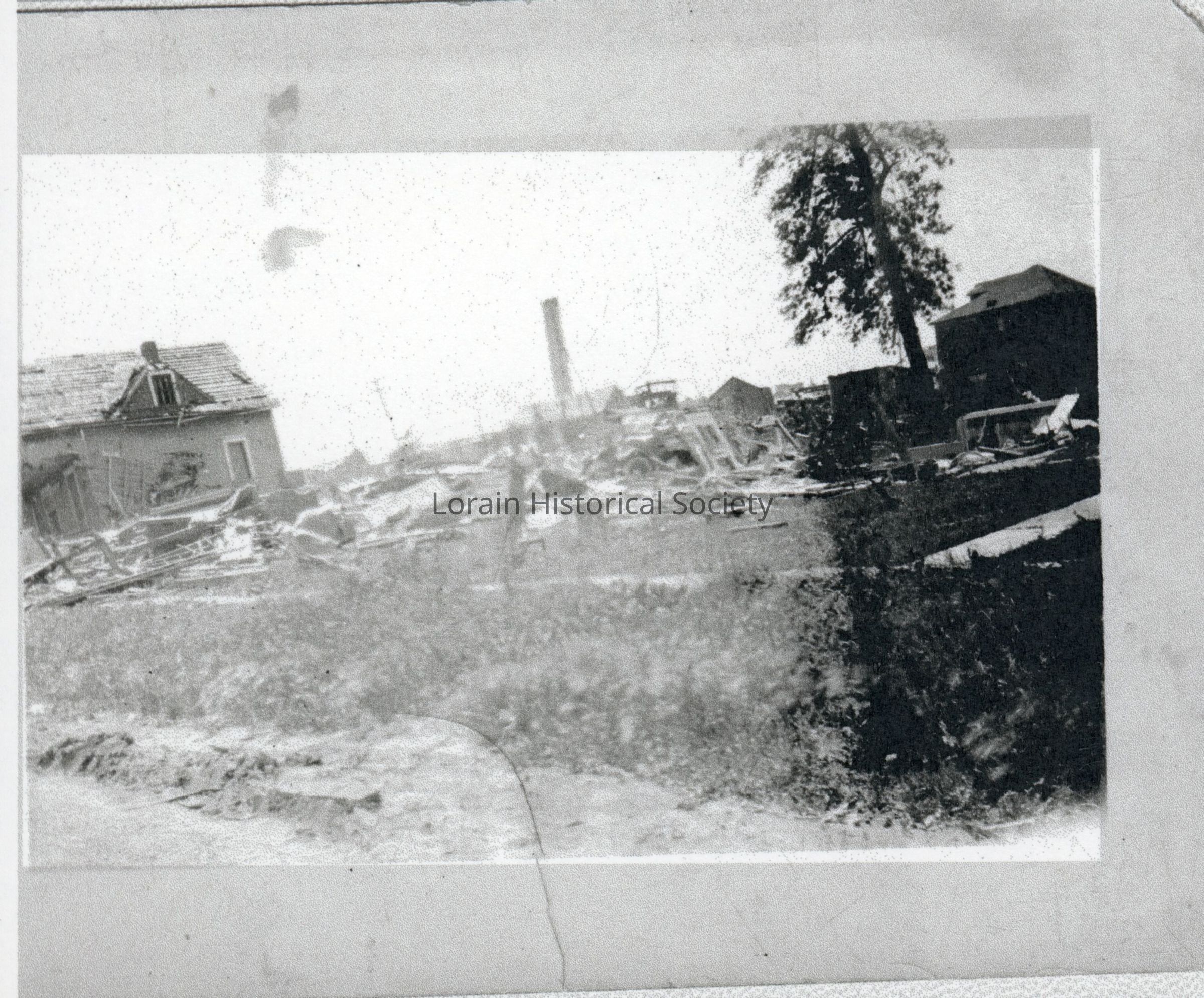 Photo copy is black and white view of unidentified houses and neighborhood showing damage, destruction and debris from 1924 Tornado. Smokestack is visible in background.Acquisition