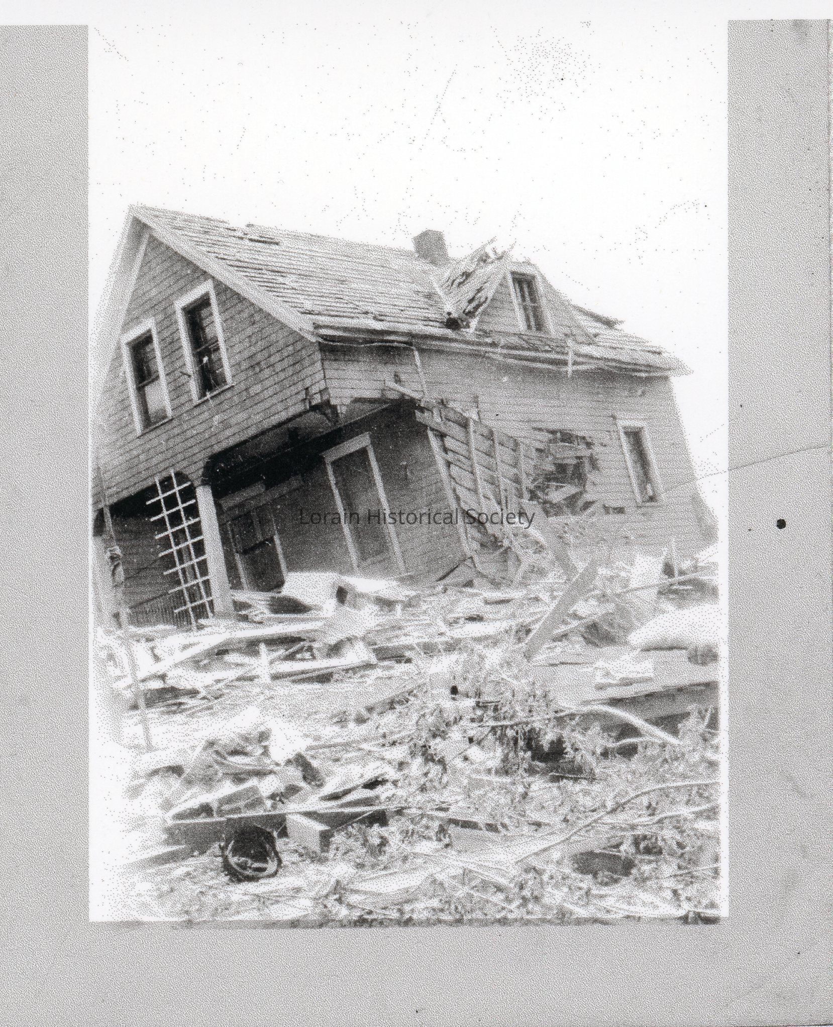 Photocopy of photograph is black and white view of unidentified house showing damage and destruction from 1924 Tornado.Acquisition