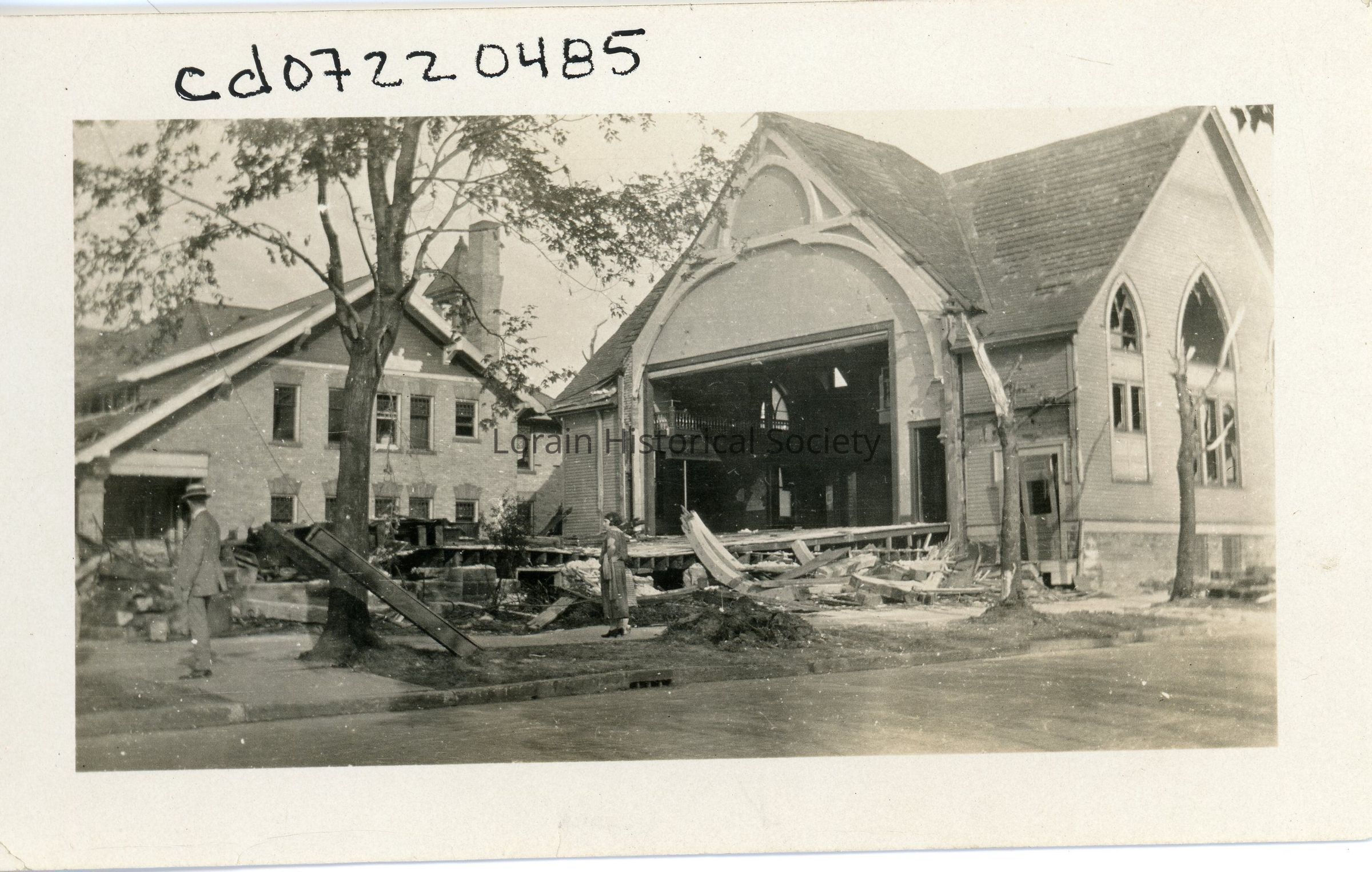 Photograph is black and white view of Fire Station No. 1 (left), 605 West Fourth Street, and First Congregational Church (right), corner of West Fourth Street and Washington Avenue, showing destruction and debris after clean up from 1924 Tornado.
