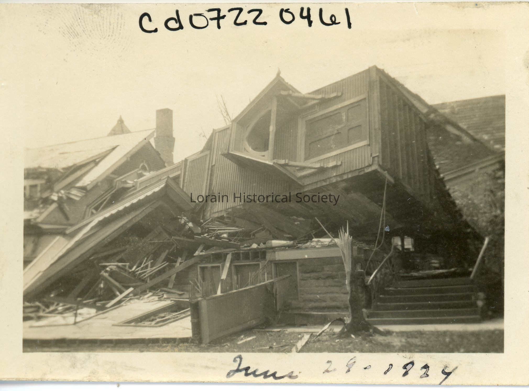 Photograph is black and white view of First Congregational Church, corner of West Fourth Street and Washington Avenue, with steeple toppled on Fire Station No. 1 next door, 405 West Fourth Street, and showing damage and destruction from 1924 Tornado.