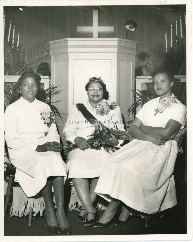 Second Baptist Church. Three women seated at the podium by the altar. Back of photo reads, "Women's Day 11-22-1959." Women are wearing dresses and corsages on their dresses. Center woman is holding a bouquet of flowers and wearing a sash "Fest Wo---" or "Best Wo---"Collection