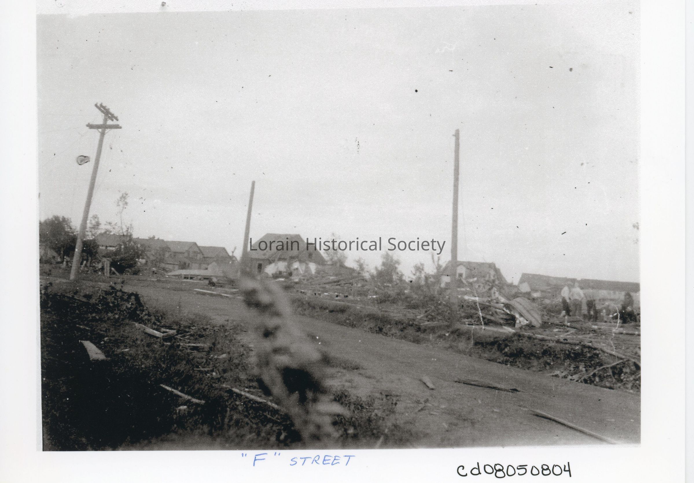 Photograph is black and white view of unidentified houses on F Street showing damage, destruction and debris from 1924 Tornado.