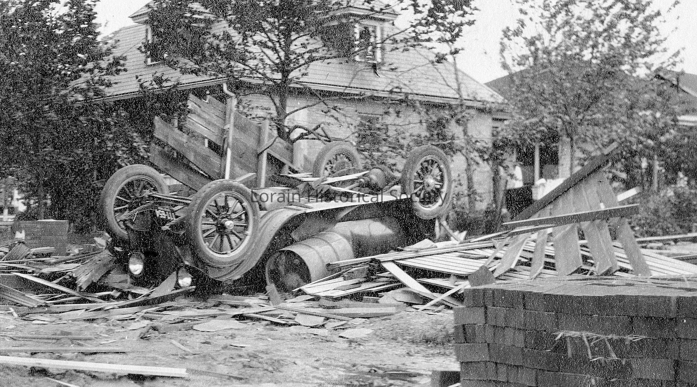 Photograph is black and white view of unidentified house showing damage, destruction, debris and overturned automobile (in foreground) from 1924 Tornado.