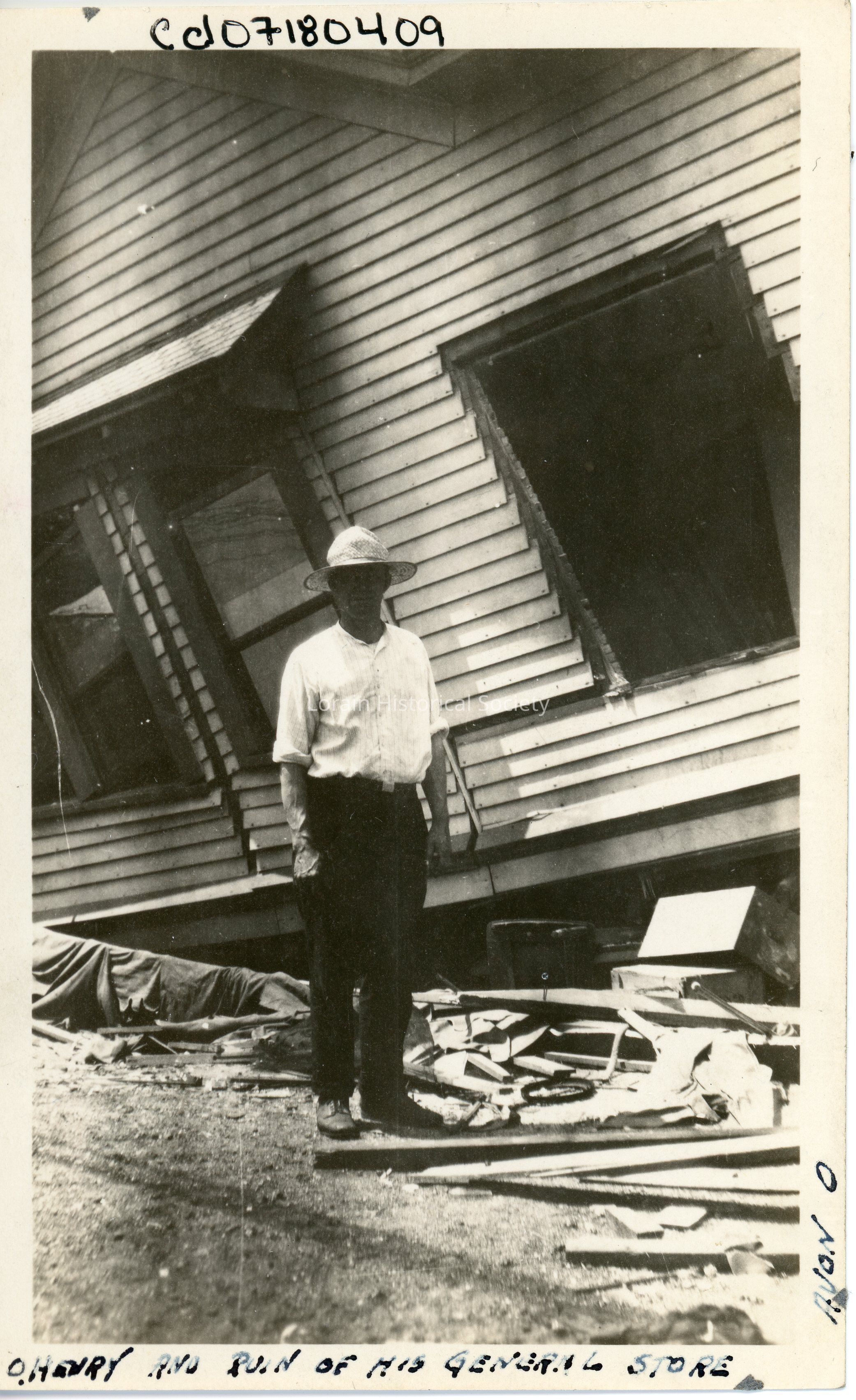 Photograph is black and white view of O. Henry standing in front of the ruins of his general store in Avon, Ohio from 1924 Tornado.