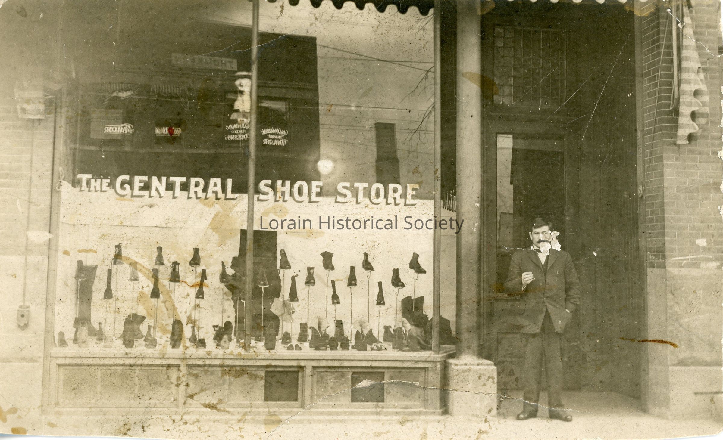 A black and white postcard photograph of the Central Shoe Store, located at 1900 Broadway in Lorain, Ohio from 1920 - 1929. Written on the back of the postcard in red marker "John Hamalke's (??) Shoe store."Acquisition