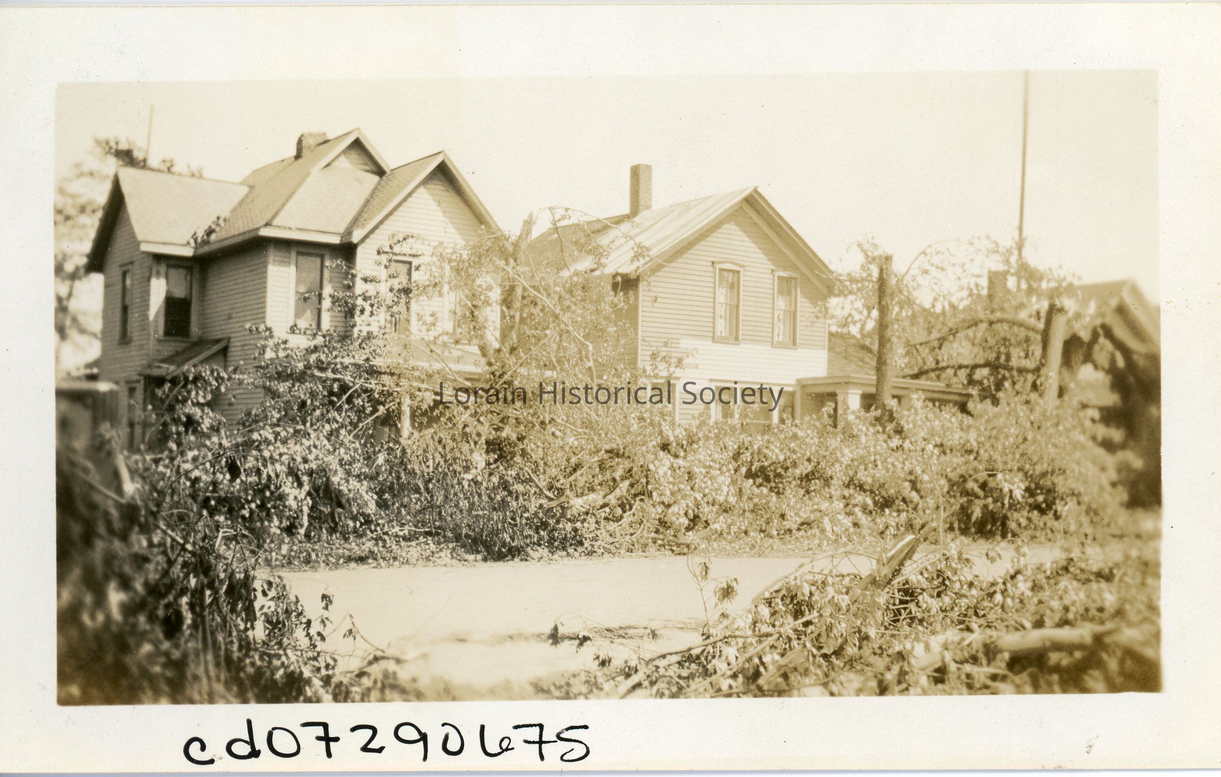 Photograph is black and white view of houses and landscape damaged by 1924 Tornado. Might be Washington Avenue between West Sixth and West Eighth Streets.Acquisition