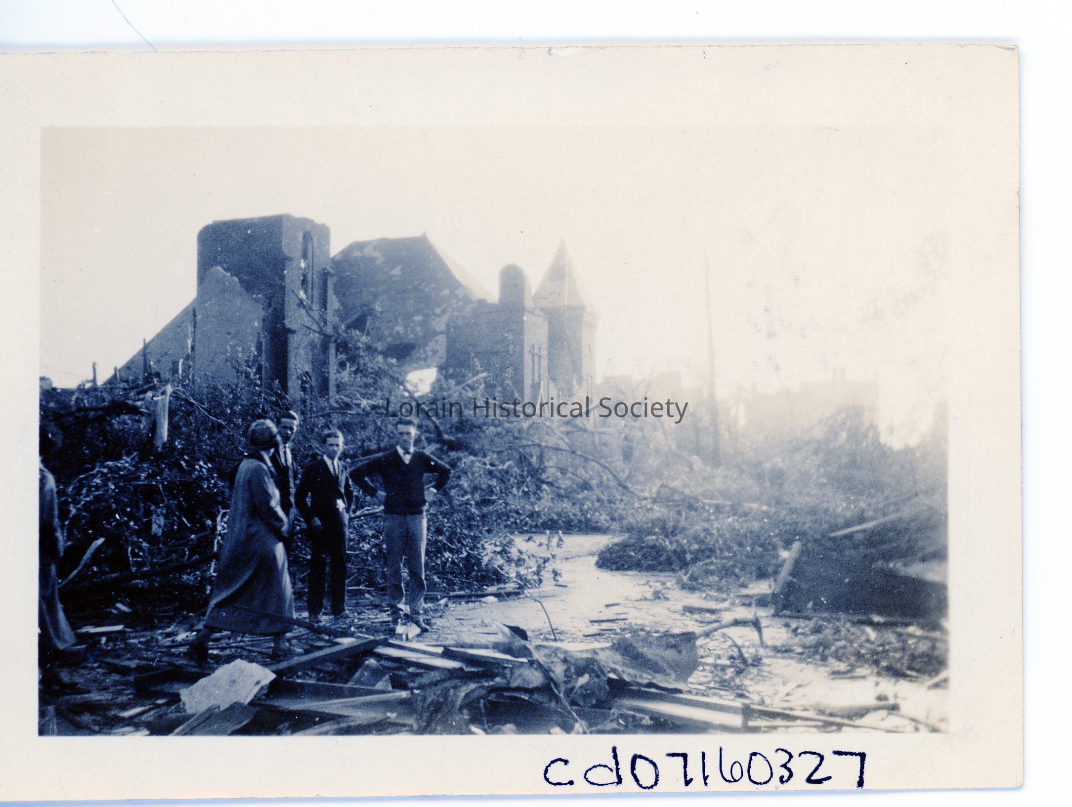 Photograph is black and white view of the corner of West Sixth Street and Reid Avenue with First Methodist Episcopal Church, 224 West Sixth Street, in background, showing damage and destruction from 1924 Tornado.Acquisition
