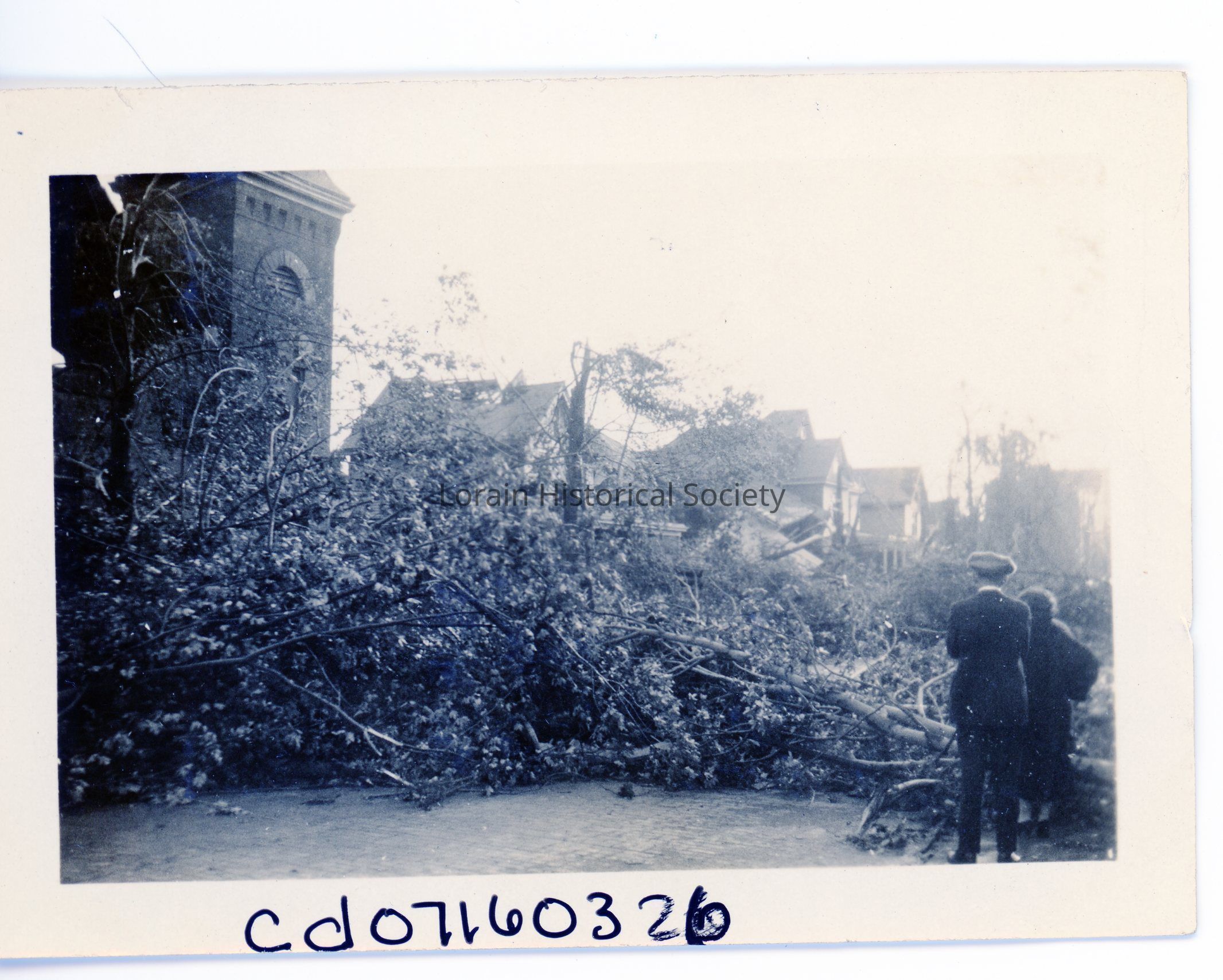 Photograph is black and white view of First Methodist Episcopal Church, 224 West Sixth Street, showing damage & destruction from 1924 Tornado. Photo taken 6/28/1924. L To R: 224 West Sixth Street, First Methodist Episcopal Church; 218 West Sixth Street, William D. Reed Home; 214 West Sixth Street, Flora and J. Ford Thompson Home; 206 West Sixth Street, Ernest J. Harrington Home; 202 West Sixth Street, Mrs. Hilda Selesky Home; 203 West Sixth Street, Alice M. and Dr. A. N. Garver Home.Acquisition
