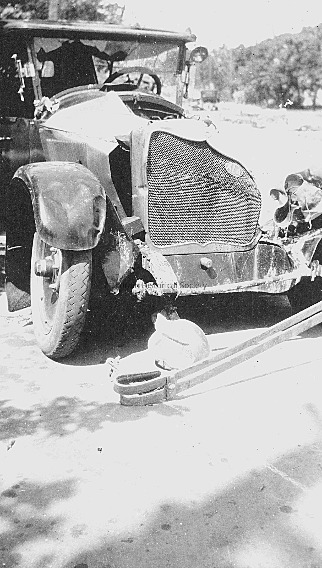 Photograph is black and white view of automobile damaged in 1924 Tornado at Barsky's National (Fisher Barsky, Tobacco), 332 Broadway.