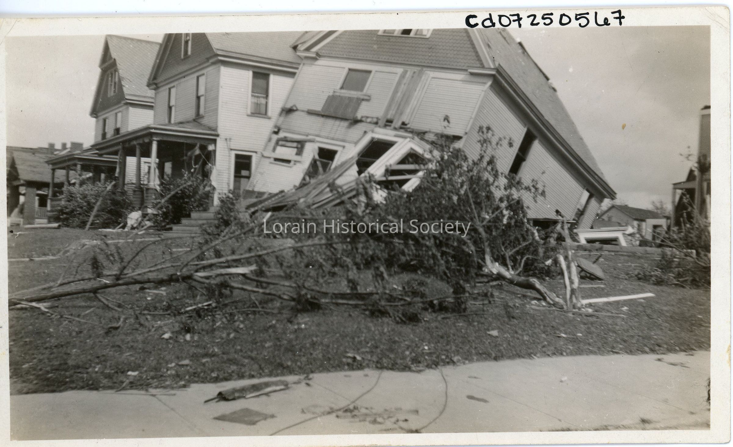 Photograph is black and white view of houses on West Erie Avenue showing damage, destruction and debris from 1924 Tornado.