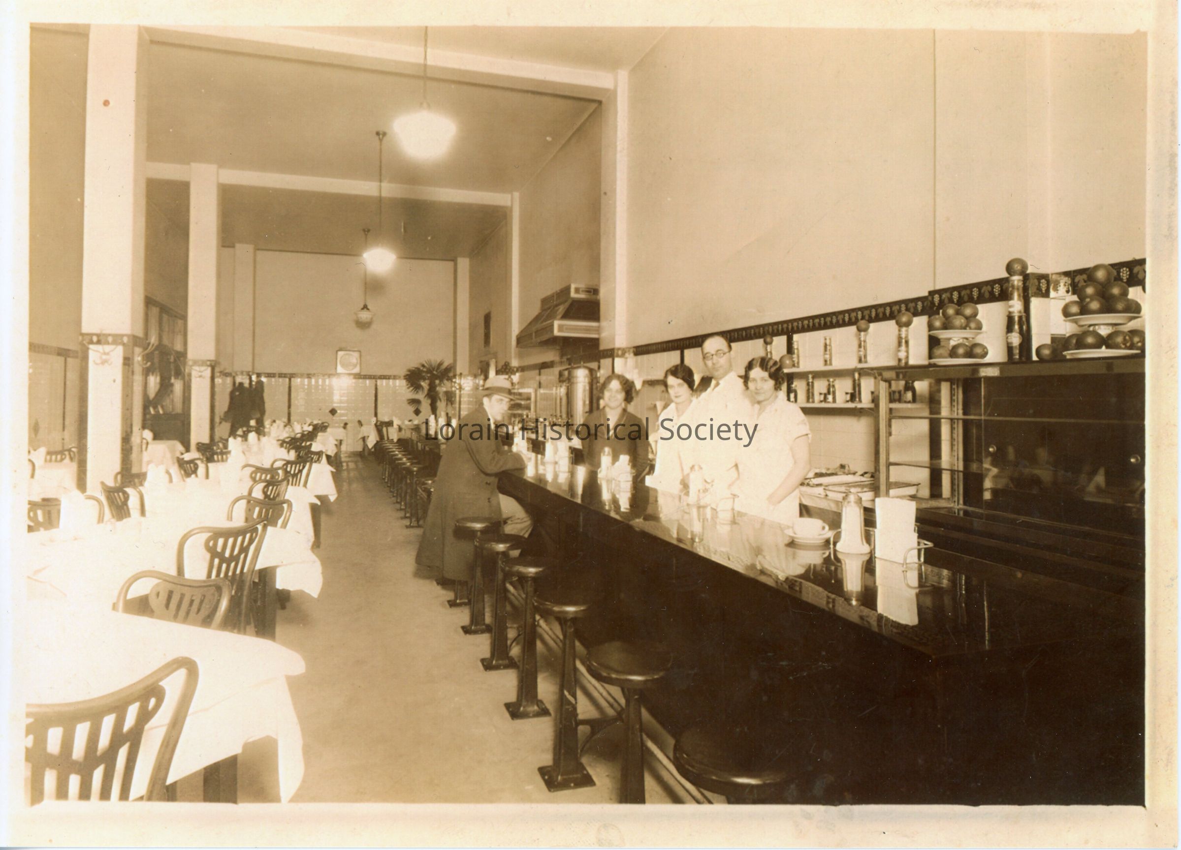A B&W photocopy of the restaurant in the Broadway Building. c. 1930. The two women in white are the donor's great aunts, Charlotte Rigo (L) and Margaret Rigo (R). The other two people in the photo are unidentified. They worked in the restaurant located in the 'Broadway Building' in 1930. The photo shows a lunch counter running the length of the room and on the opposite side, tables and chairs. One customer is sitting at the counter and the manager and three employees are standing behind the counter.Acquisition