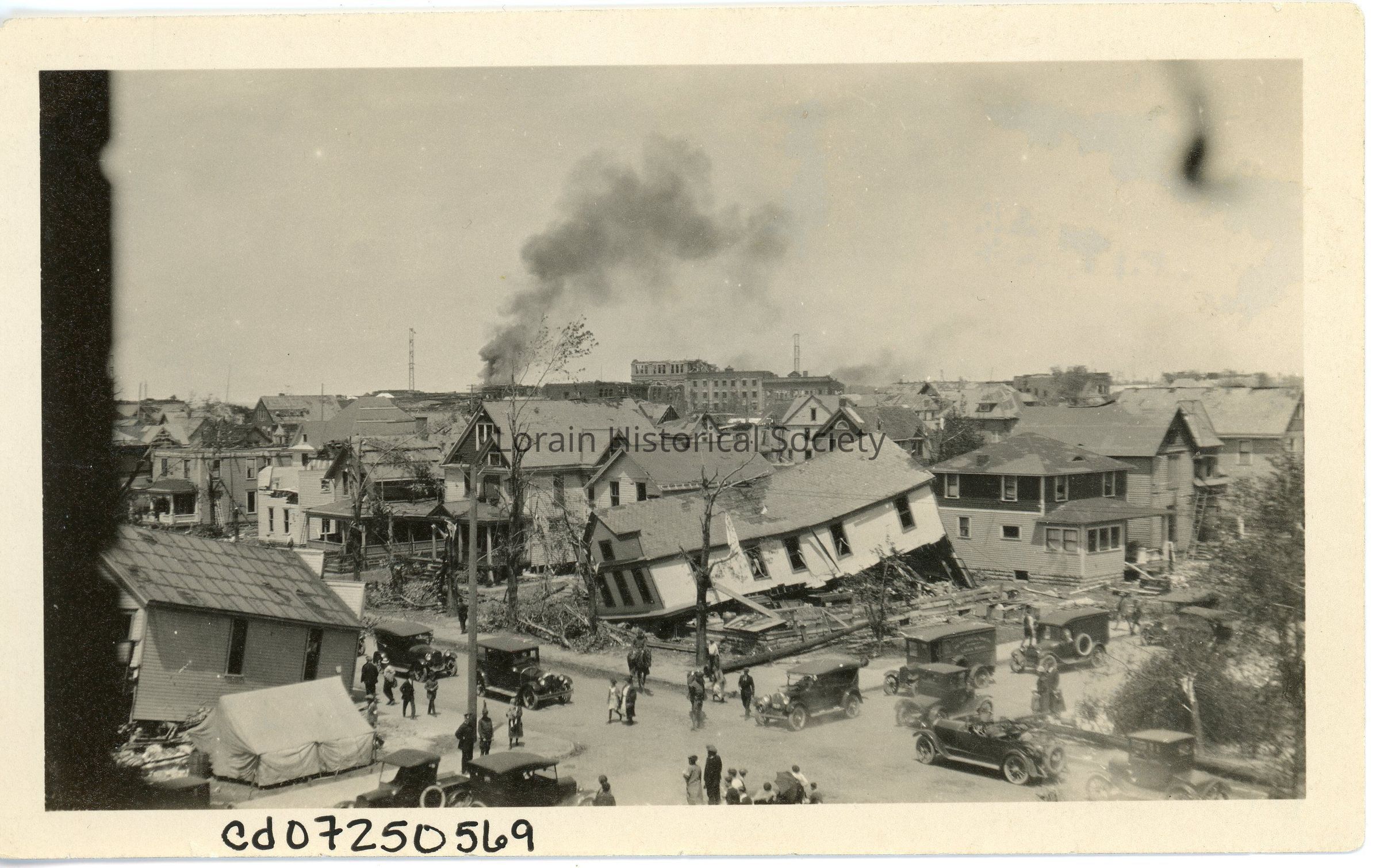 Photograph is black and white view of West Sixth Street and Washington Avenue looking northeast toward Broadway showing damage, destruction and debris from 1924 Tornado. Gould's Grocery Store, 560 Washington Avenue, is in center foreground. Wagner Building on Broadway can be seen in center background.Photograph Details