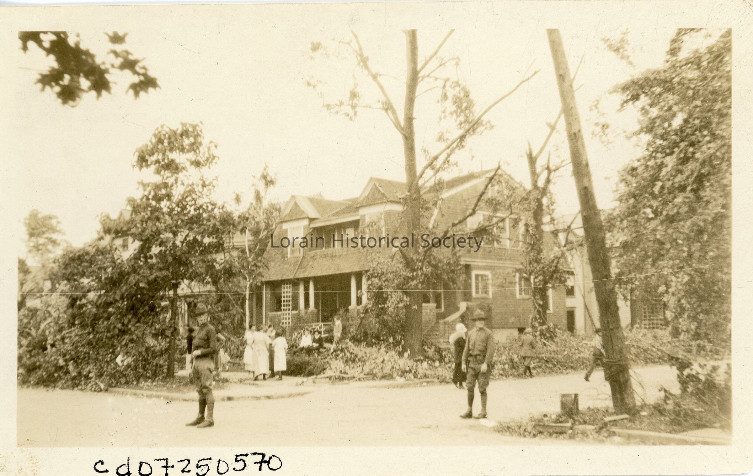 Photograph is black and white view of 777 Washington Avenue, Mabel P. and Dr. Bert E. Garver Home, showing damage and debris from 1924 Tornado. National Guardsmen are standing in the intersection of Washington Avenue and West Eighth Street.Collection