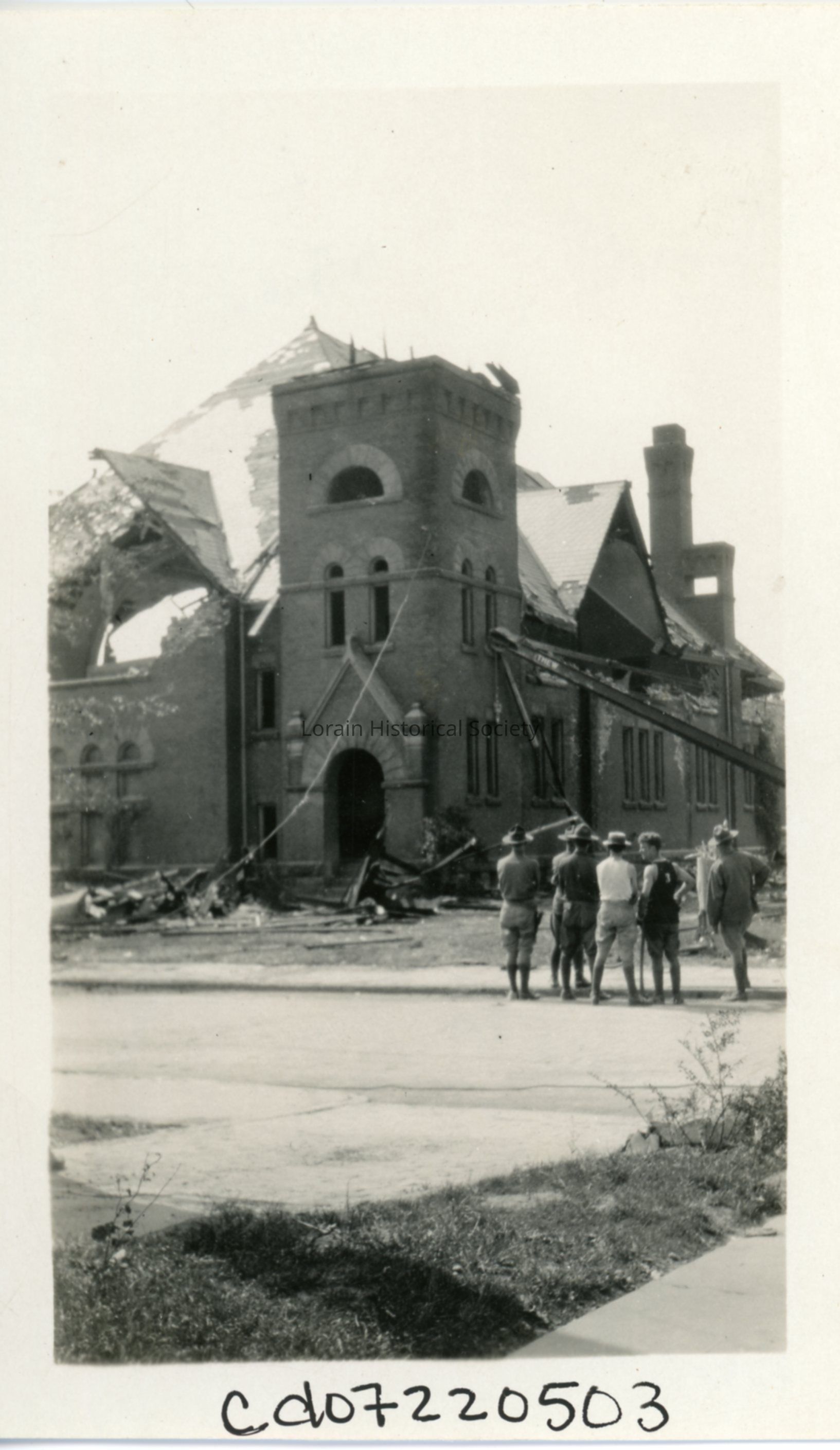 Photograph is black and white view of First Methodist Episcopal Church, 224 West Sixth Street, showing damage and destruction from 1924 Tornado.Photograph Details