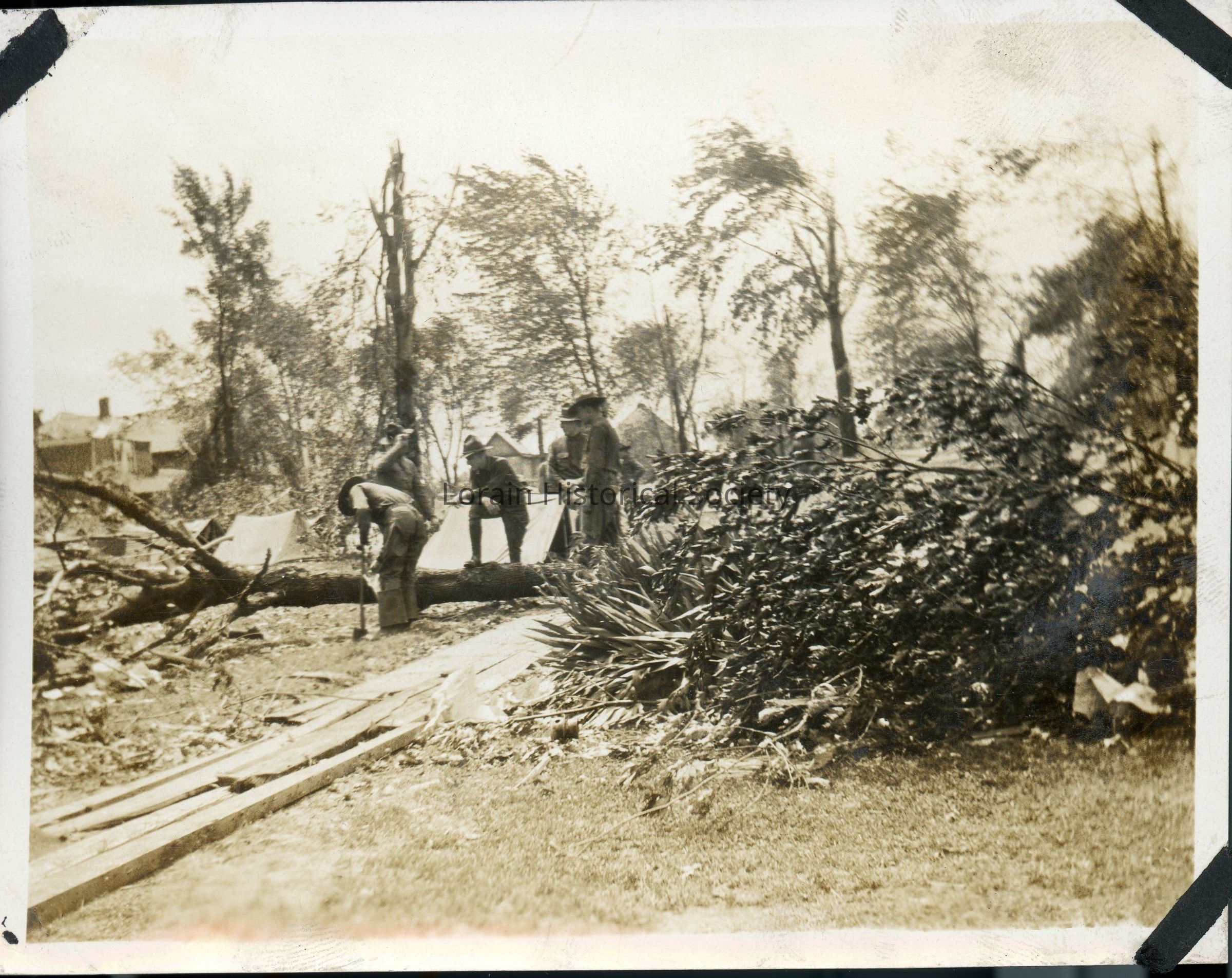 Photograph is black and white view of National Guardsmen near "Tent City" at South Lakeview Park after 1924 tornado, showing tents, damage and debris from 1924 Tornado.Photograph Details
