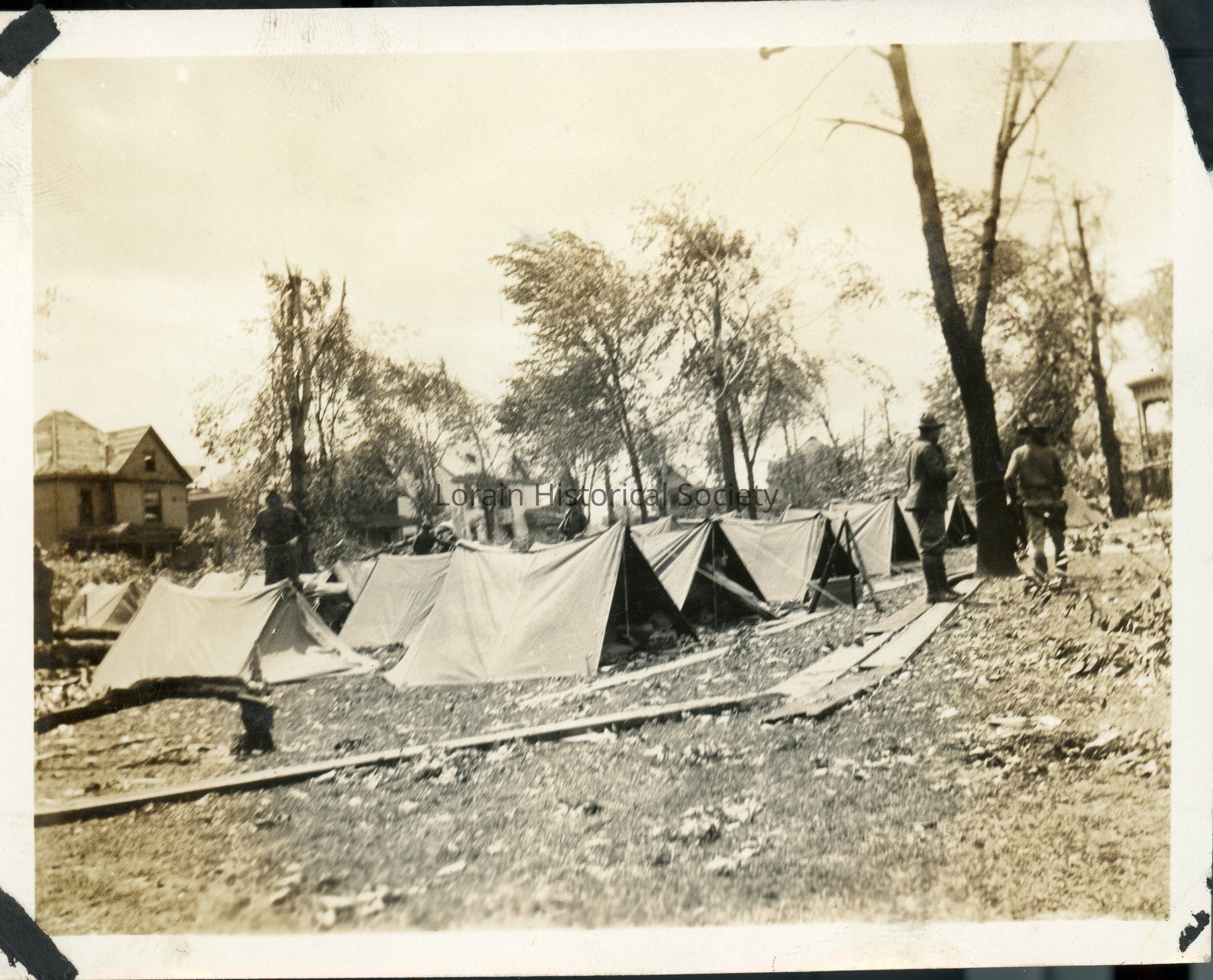 Photograph is black and white view of "Tent City" at South Lakeview Park, where residents whose homes were destroyed or damaged lived until their homes could be repaired or rebuilt.Photograph Details
