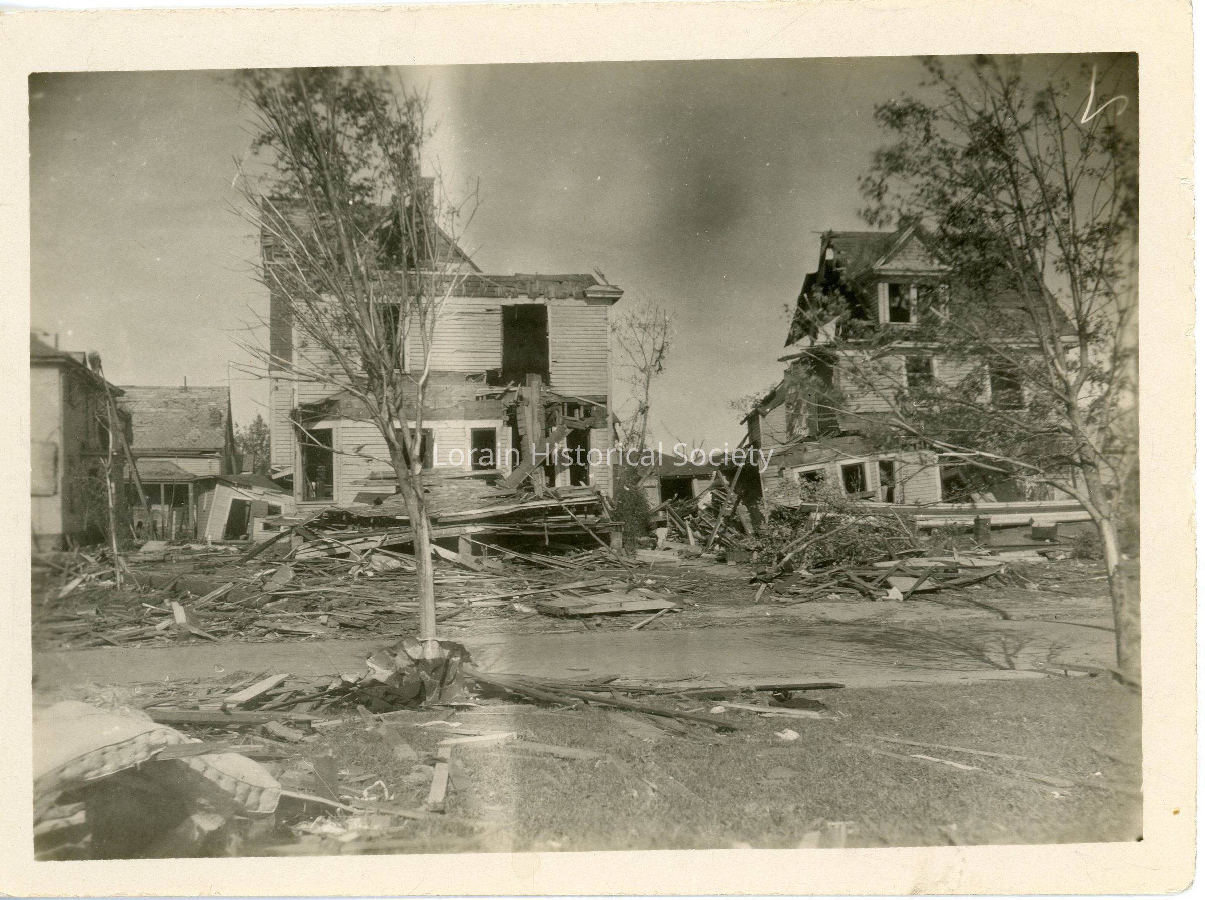 Photograph is black and white view of unidentified houses showing damage and destruction from 1924 Tornado.