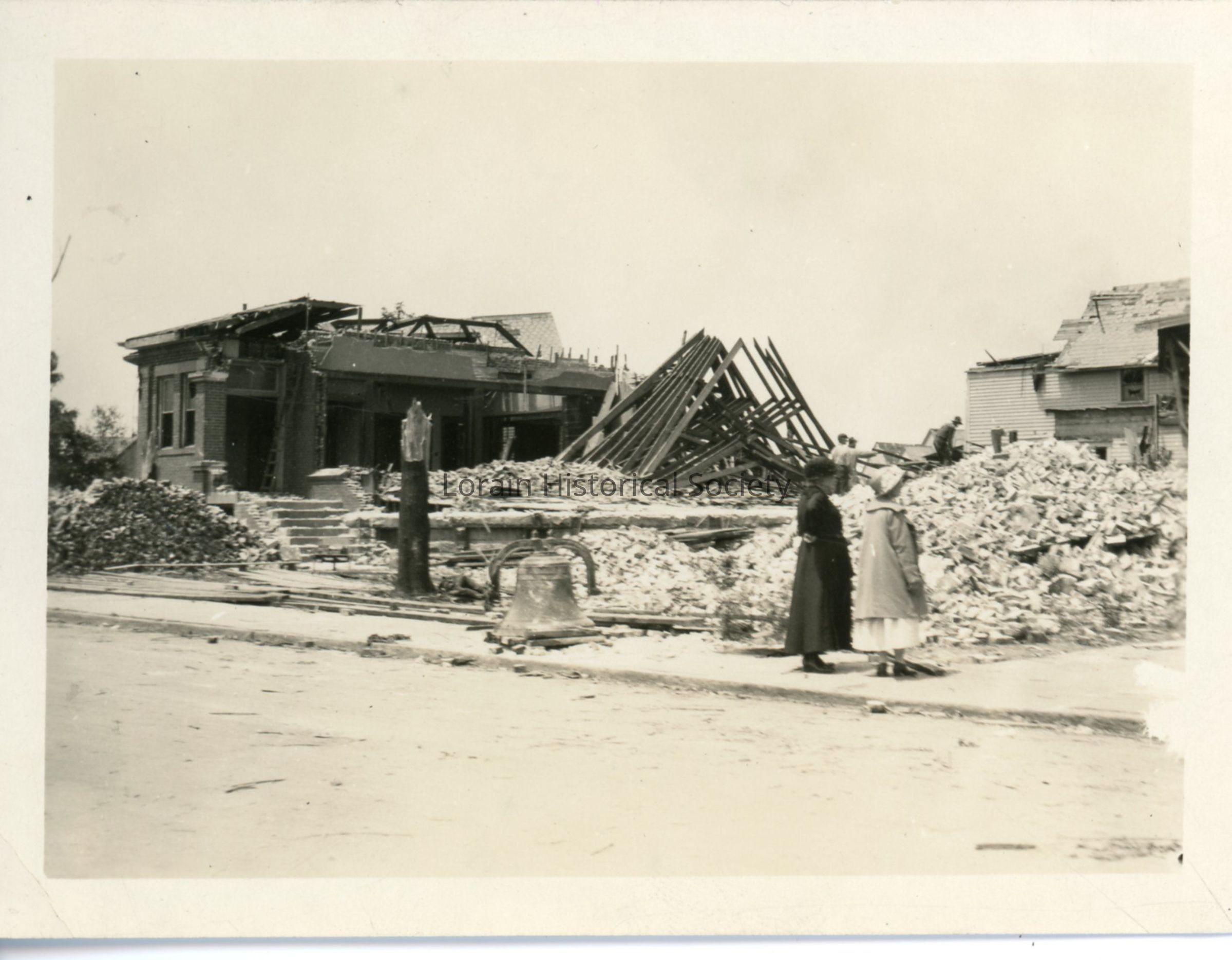 Photograph is black and white view of debris and bell from Delaware Avenue ME Church, 658 East Erie Avenue (corner of Delaware Avenue and East Erie Avenue) in right foreground. The church was one of two completely destroyed in the 1924 Tornado. The building on the left is unidentified. Two unidentified woman are standing on the sidewalk in right foreground looking at the damage. Unidentified house in right background is showing damage and destruction.Photograph Details