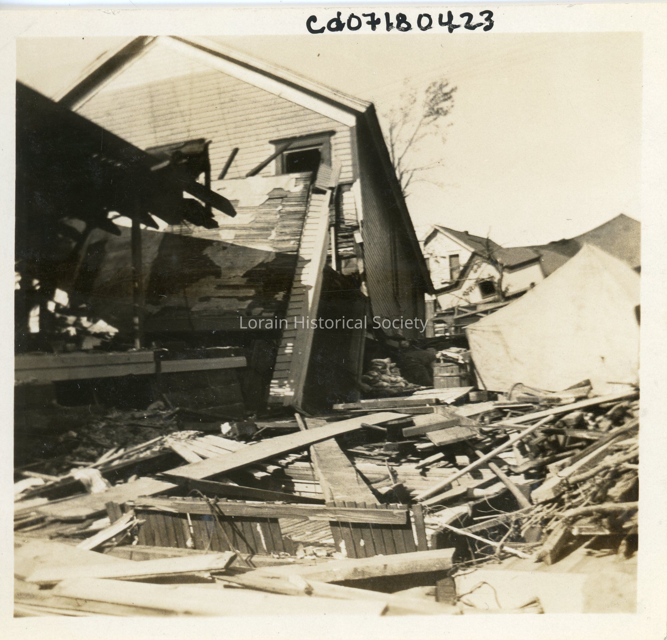 Photograph is black and white view of corner of West Sixth Street and Washington Avenue showing damage and destruction from 1924 Tornado.