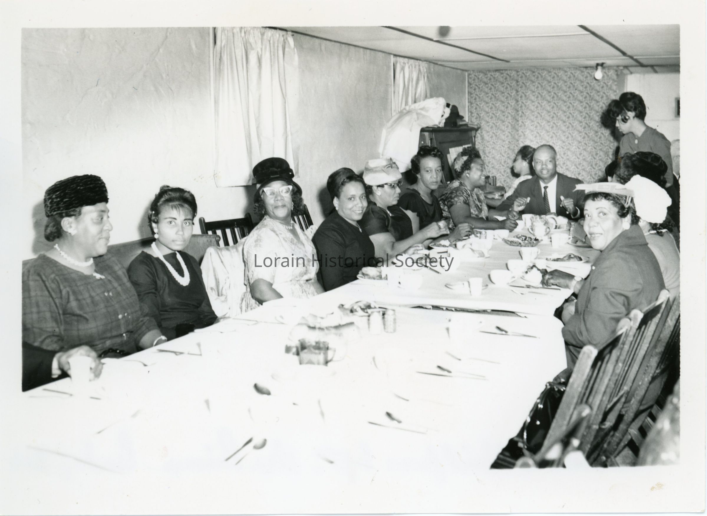 Women seated a table set up for an event. One man is at the head of the table. Back of photo reads, "Leon Hogg Photographer Oct 1, 1963. Grandmother third from the left. Dr. Primus (dentist) at head of table.Collection