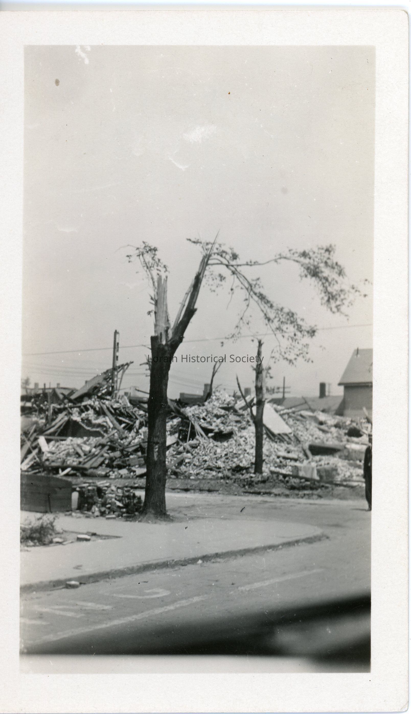 Photograph is black and white view of unidentified houses showing debris from a house that was destroyed in 1924 Tornado with damaged tree in foreground.Acquisition