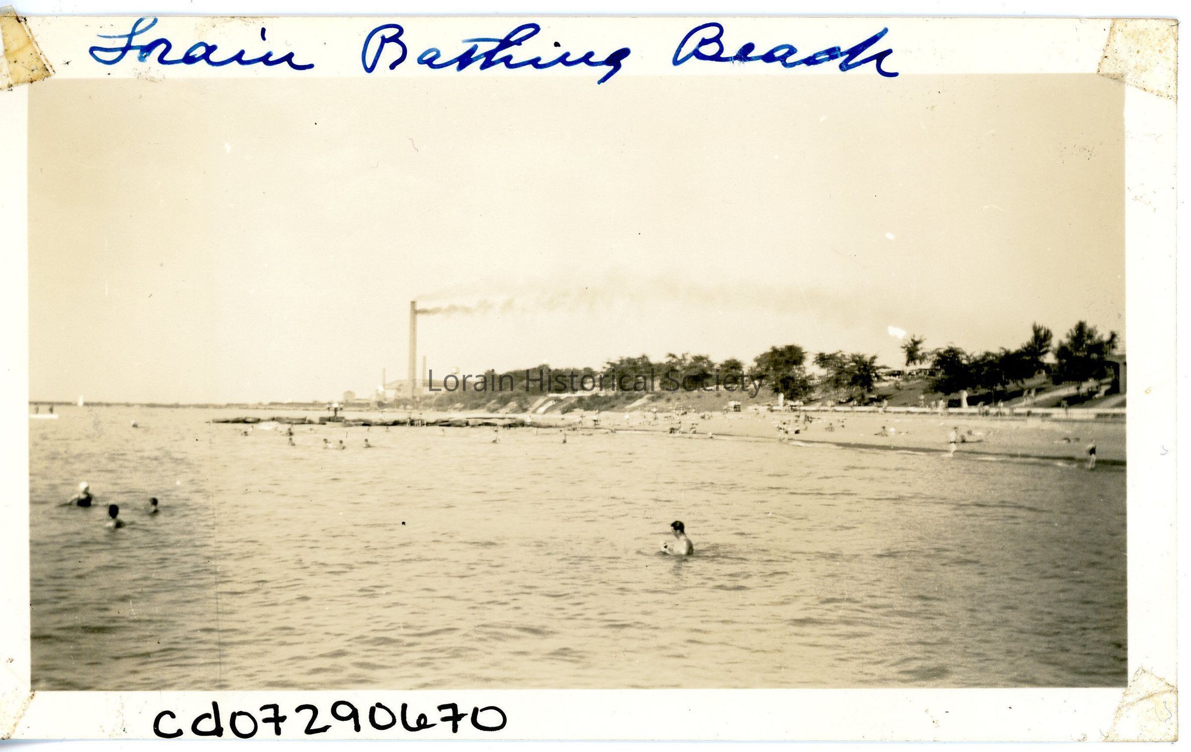 Photograph is black and white view of Lakeview Bathing Beach. Photo is captioned: "Lorain Bathing Beach".Acquisition