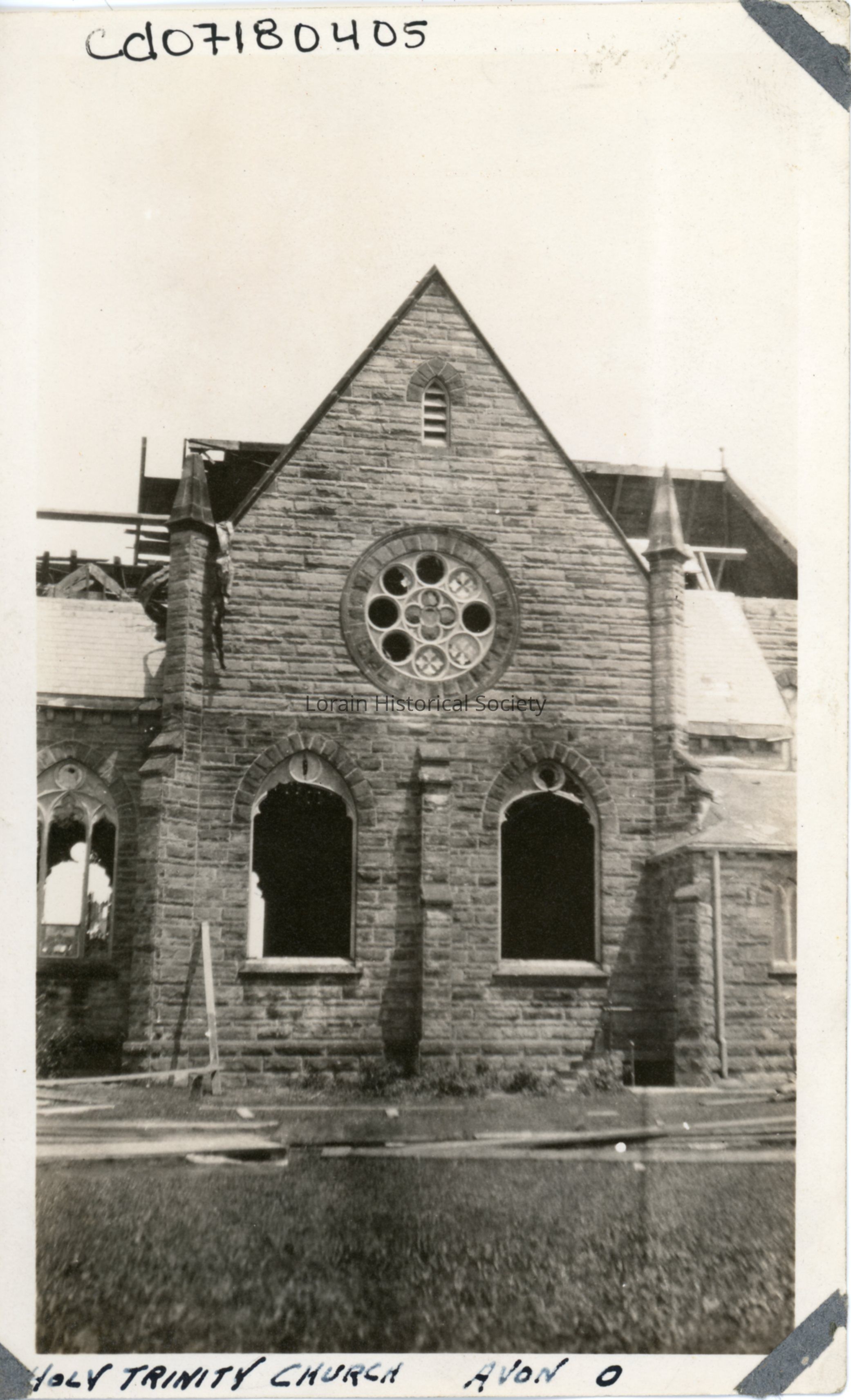 Photograph is black and white view of Holy Trinity Church, 33642 Detroit Road, Avon, Ohio, showing damage and destruction from 1924 Tornado.Photograph Details