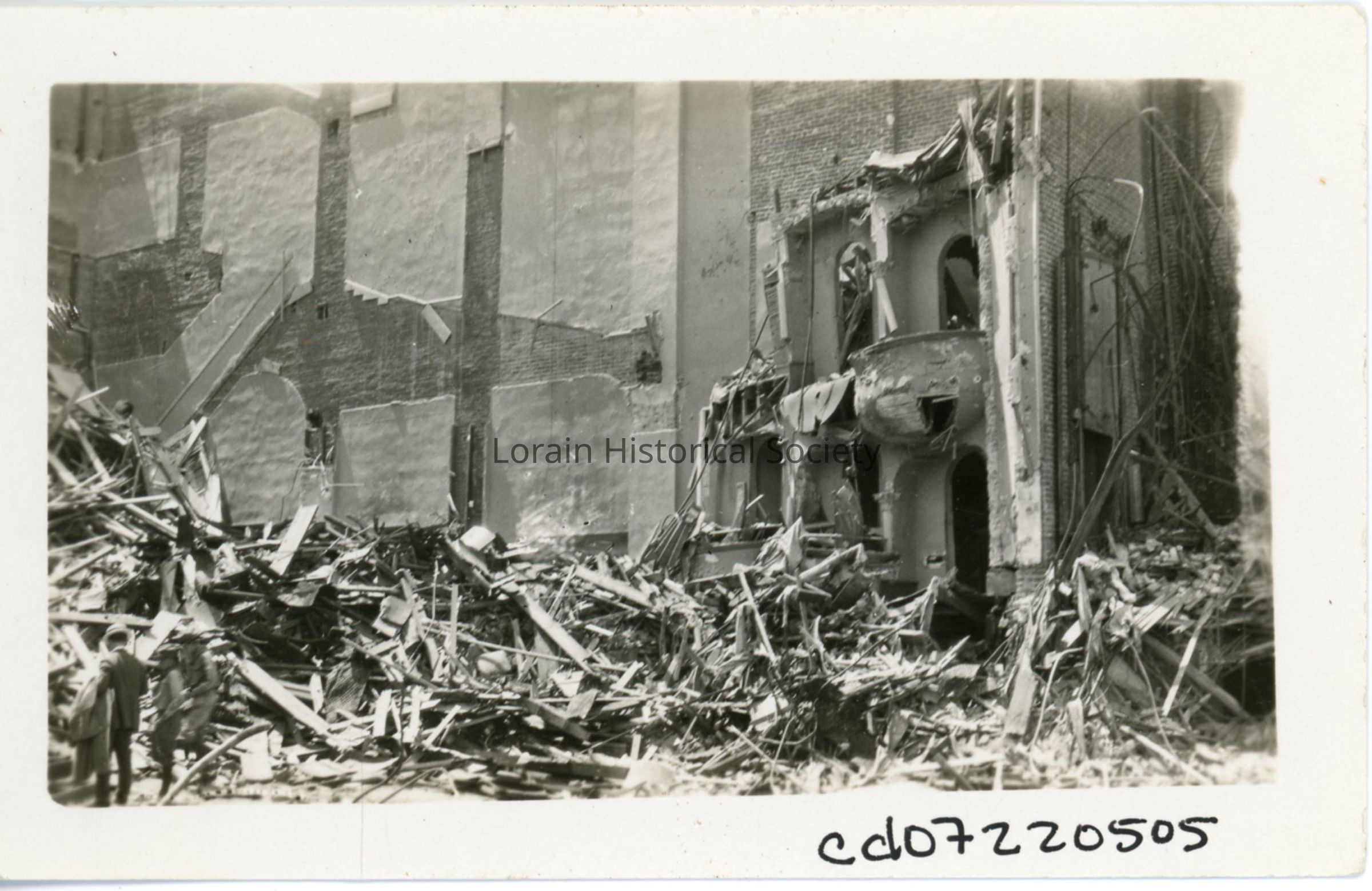 Photograph is black and white view of State Theatre, 375 Broadway, showing complete destruction from 1924 Tornado.Photograph Details