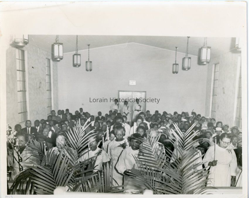 Second Baptist Church inside looking from altar to back of church. Women are coming up the aisle and spreading out to face the altar. They are wearing white and carrying lit candles for Women's Day. The pews are full of parishioners. 1960. Name on the back of the photo possibly says Jene or Irene Hood.Context