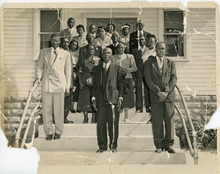 Second Baptist Church men and women standing on steps of old church building, 331 W 12th Street. 8-27-1950