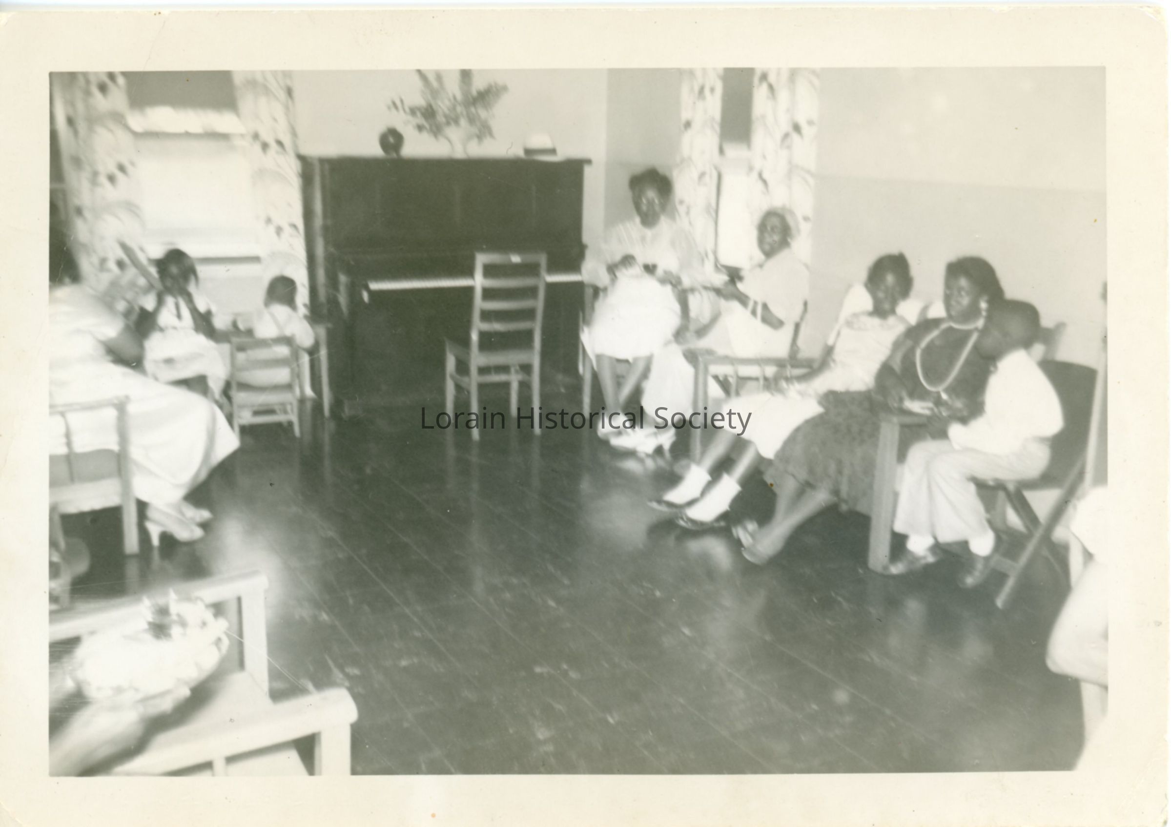 Women and children sit around a room. The room has a piano in the background. Back reads, "3's Tea 1957"Collection